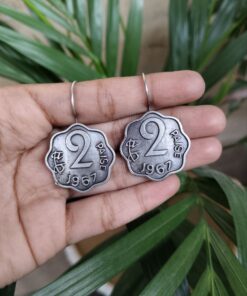 Add a vintage touch to your style with these 2 Paisa Coin Earrings, a stunning piece of silver replica oxidized jewelry that pays homage to India?s rich heritage. Featuring authentic coin hook earrings with intricate detailing, these earrings are a blend of timeless elegance and modern versatility, making them a must-have addition to your jewelry collection.