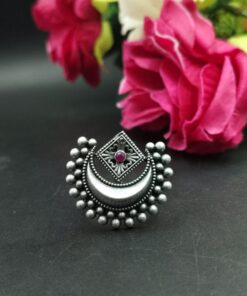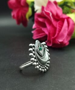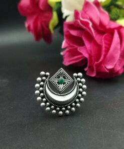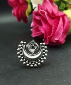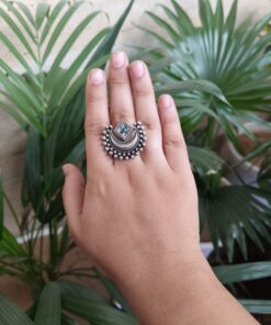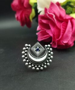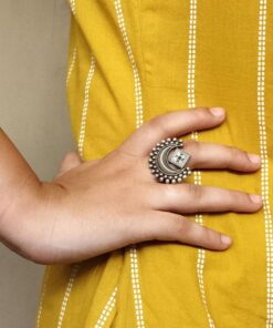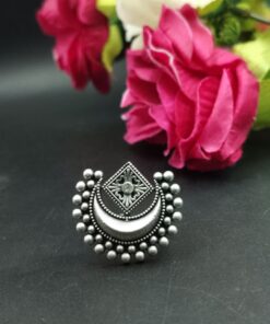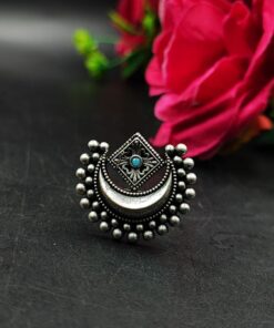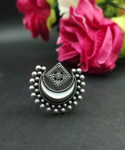 Crafted by skilled artisans, this ring is a true reflection of traditional Indian artistry. The oxidized silver plating gives it a vintage touch, making it ideal for festive occasions, weddings, or casual ethnic wear. The design is detailed with precision, and the adjustable feature ensures a perfect fit for all finger sizes, offering both comfort and elegance. Whether paired with sarees, kurtis, or fusion wear, this Half Moon Ring complements every look with effortless charm.