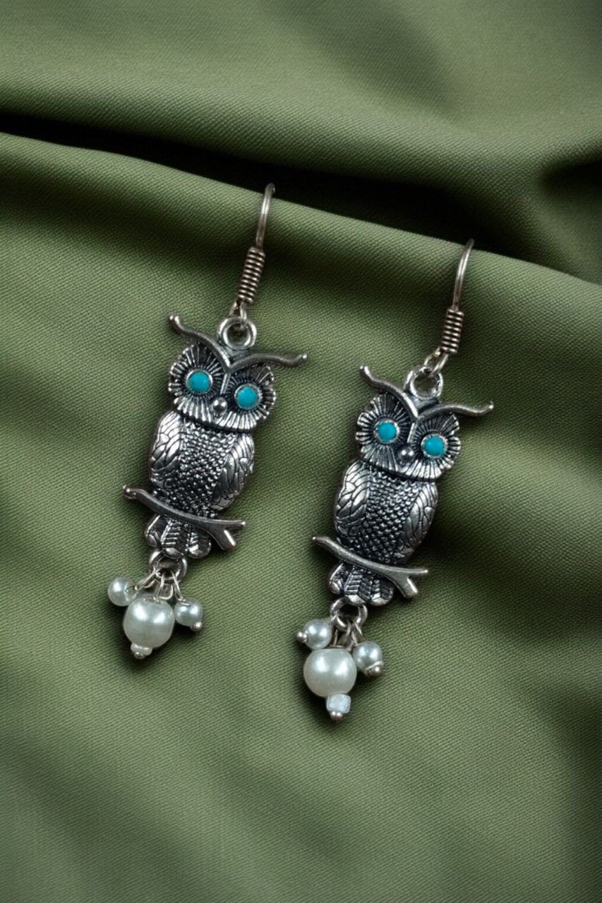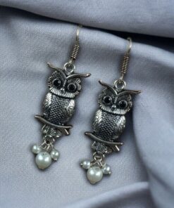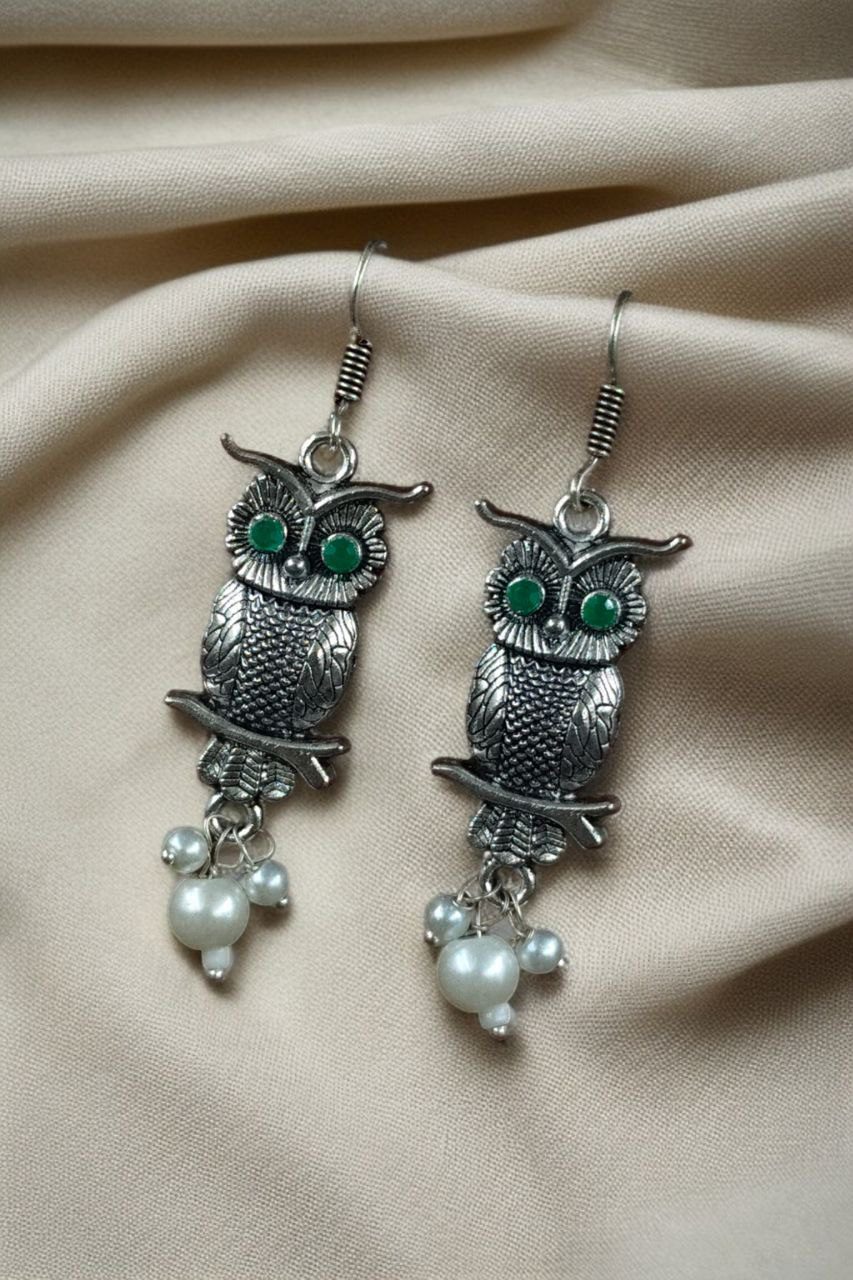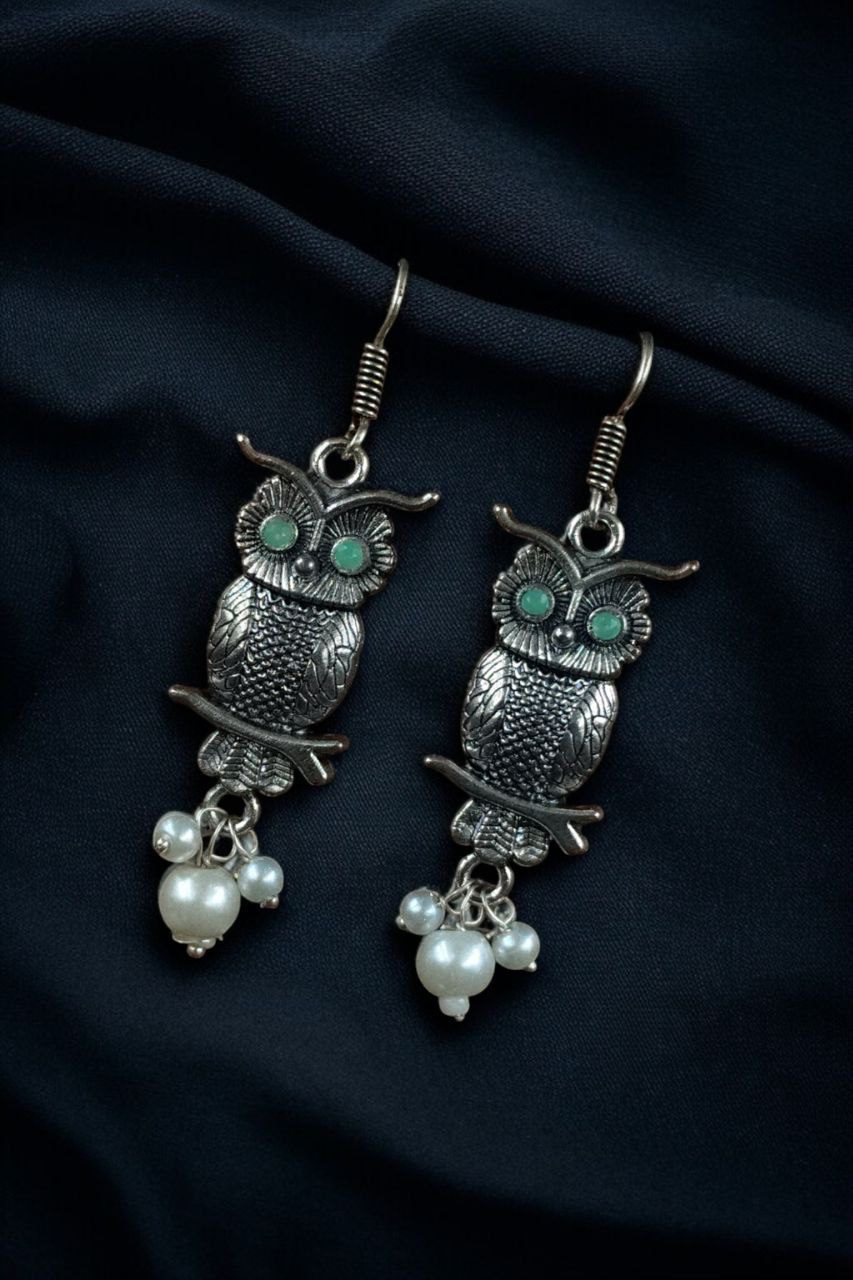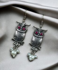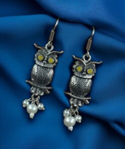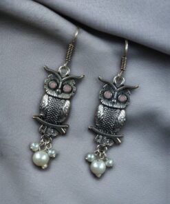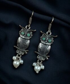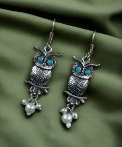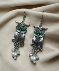 Elevate your jewelry collection with the enchanting charm of our German Silver Owl Earrings ? Western Style Dangler with Pearl & Stone. These beautifully handcrafted earrings blend ethnic grace with a modern twist, making them a perfect accessory for girls and women who love to experiment with statement pieces.