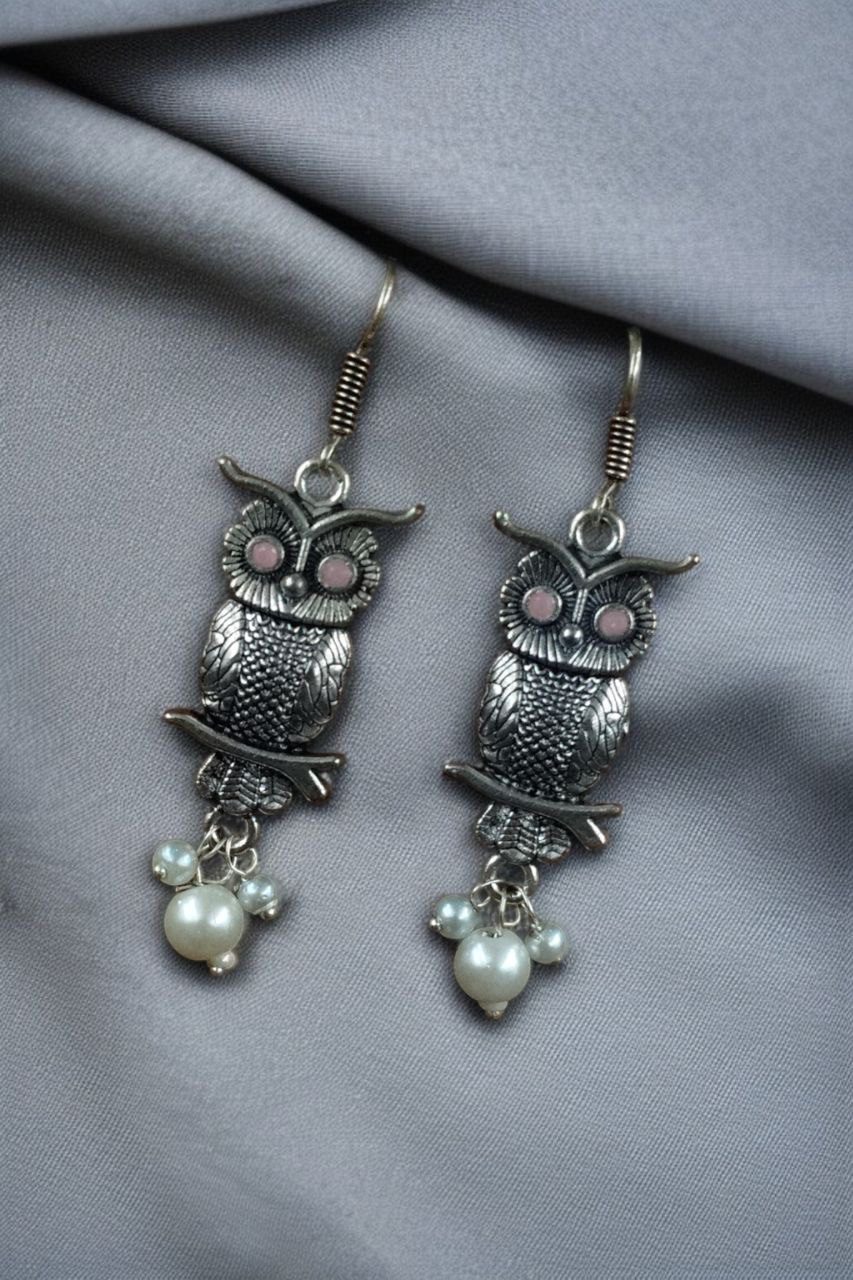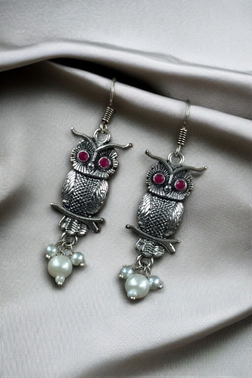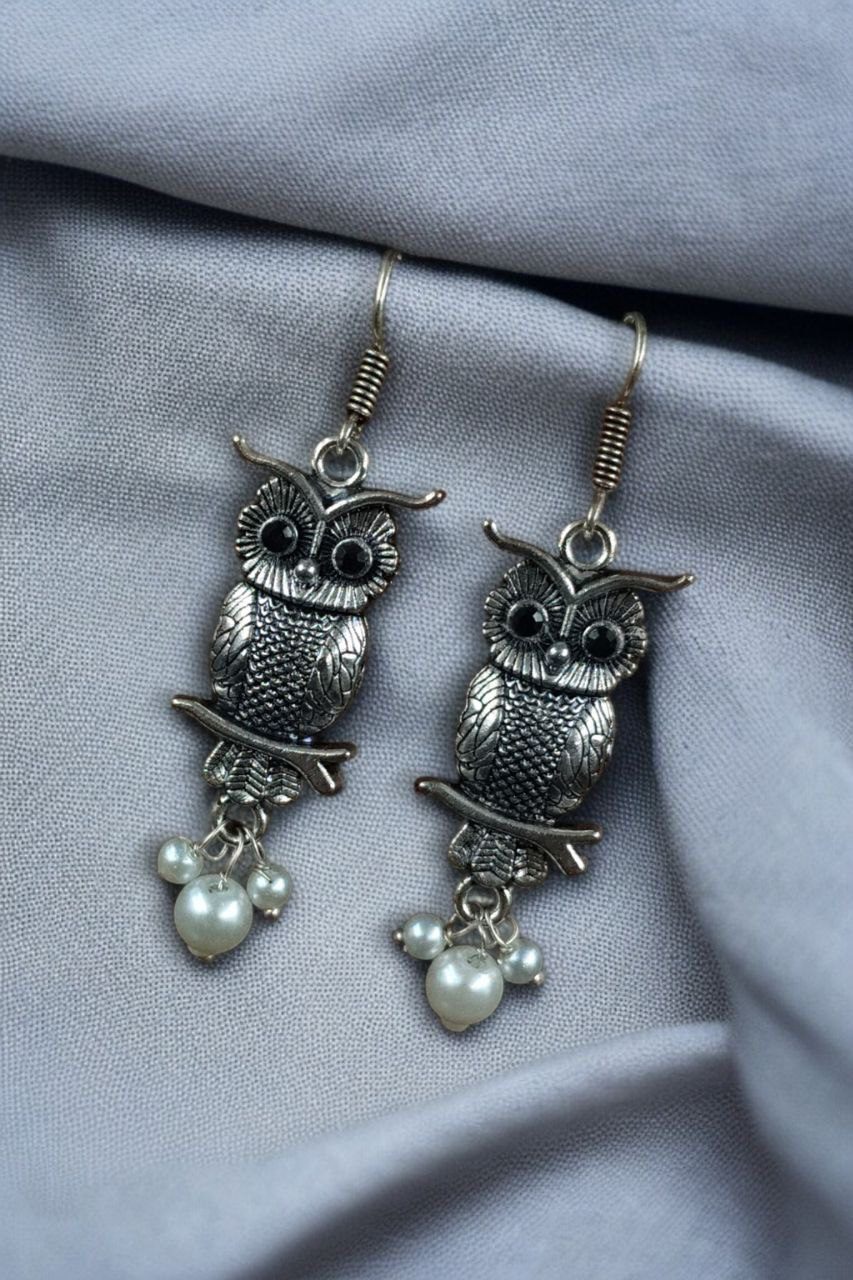 Elevate your jewelry collection with the enchanting charm of our German Silver Owl Earrings ? Western Style Dangler with Pearl & Stone. These beautifully handcrafted earrings blend ethnic grace with a modern twist, making them a perfect accessory for girls and women who love to experiment with statement pieces.