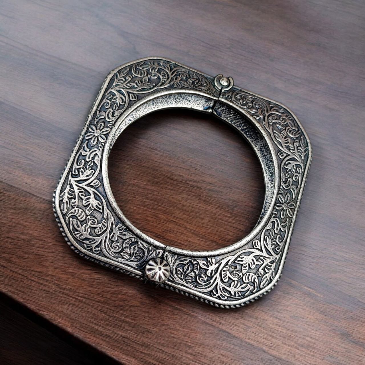 Designed with comfort in mind, this bangle features a square shape that provides a modern twist on traditional kada designs. Its openable structure ensures easy wear and removal, allowing for a comfortable fit on different wrist sizes. Whether you choose to wear it alone for a statement look or stack it with other bangles for a trendy layered style, the Ancient Look Floral Bracelet effortlessly complements your personal fashion sense.