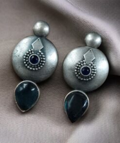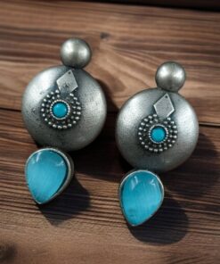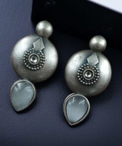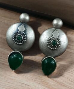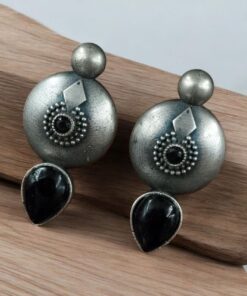 The design features a circular stud base, artistically adorned with intricate detailing that mirrors antique jewelry craftsmanship. At the center, a glimmering stone adds a graceful sparkle, making these earrings a beautiful accent for both day and evening wear. The antique silver touch gives them a vintage, oxidized appearance, enhancing their ethnic allure while ensuring they remain versatile for various outfits and occasions.
