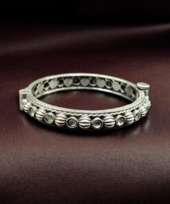 Crafted in a premium silver replica base, this openable bangle features an antique finish that enhances the depth and beauty of its design. The carefully embedded stones add a subtle sparkle, creating a balanced look that is elegant without being overpowering. The stone work highlights the fine detailing, giving the bangle a rich and luxurious appearance suitable for both daily wear and special occasions.