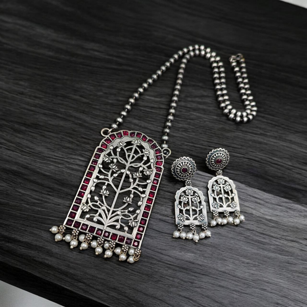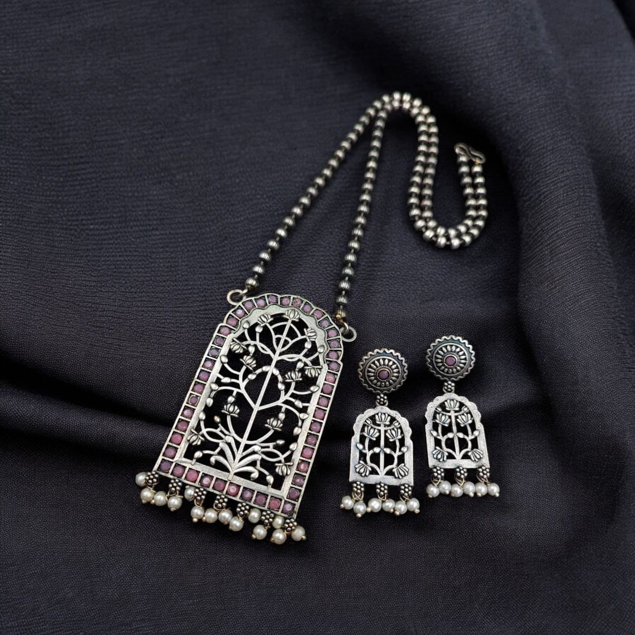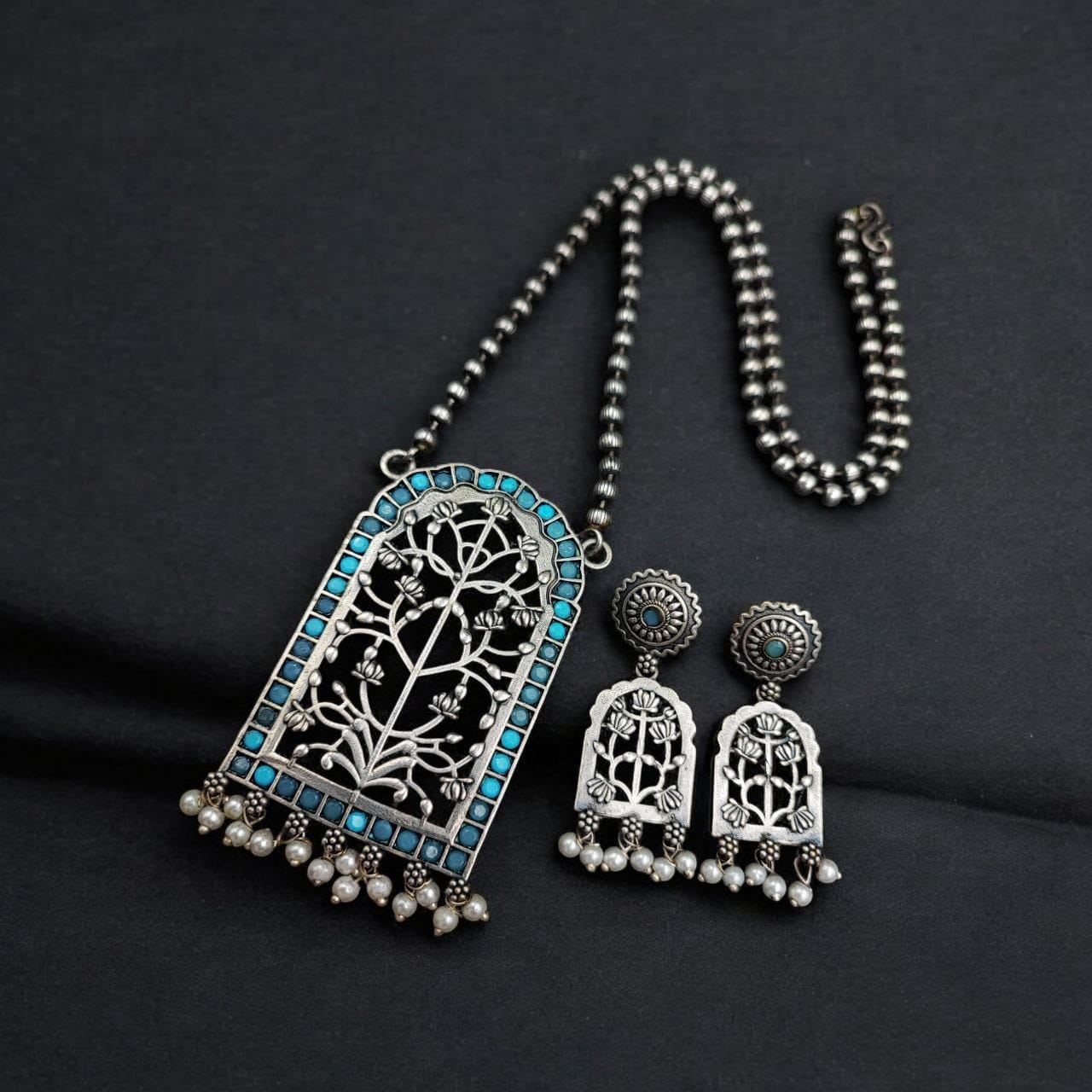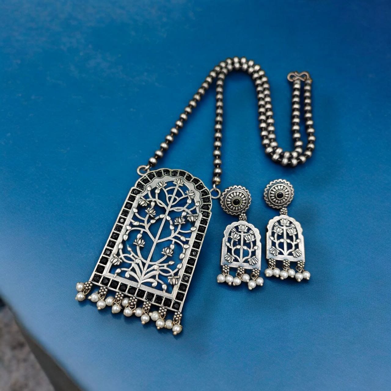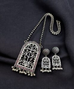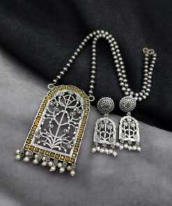 Embrace the timeless elegance of heritage jewelry with our Antique Floral Art Pendant Set, meticulously crafted to capture the charm of vintage designs. This Silver Replica Necklace, paired with matching earrings, evokes a sense of regal sophistication, making it an essential addition to any jewelry collection. Ideal for special occasions or as a statement piece for everyday wear, this Silver Replica Necklace set is designed to reflect the beauty of traditional craftsmanship with a modern twist.