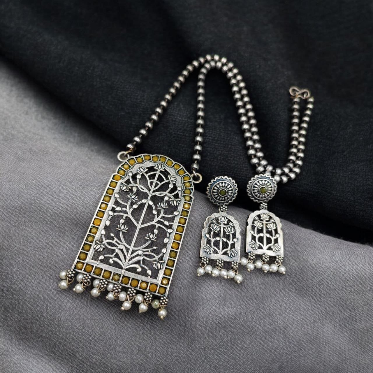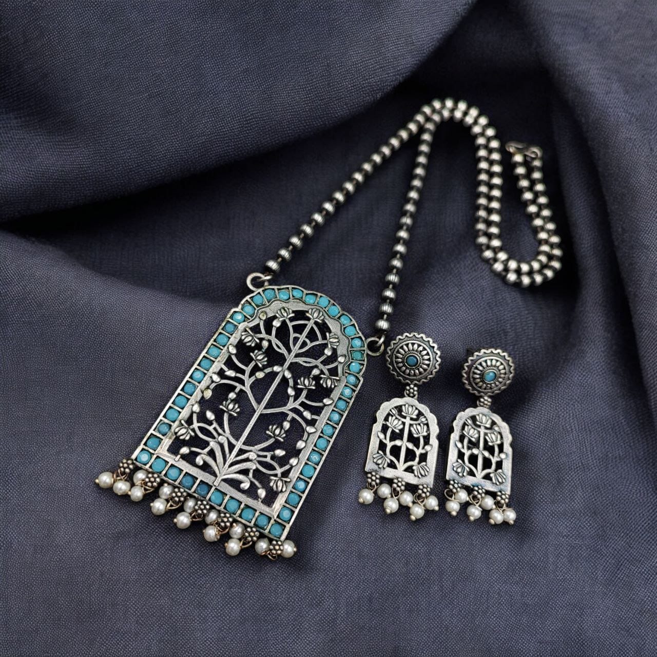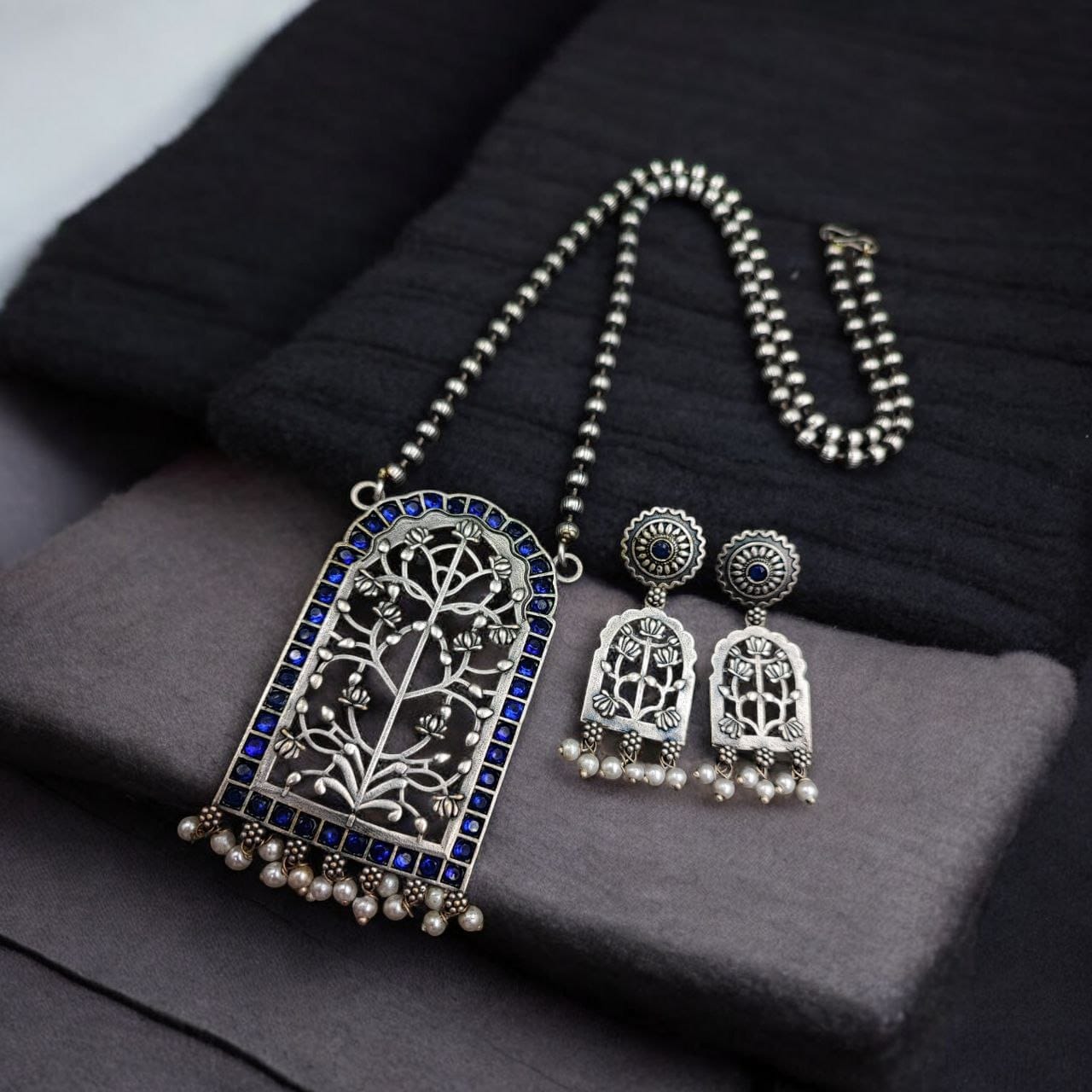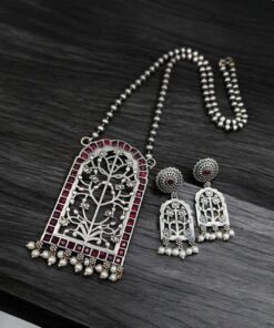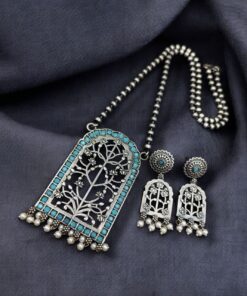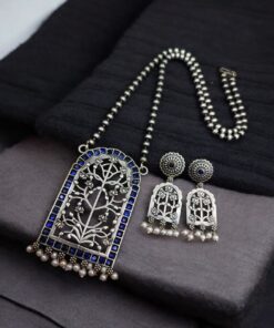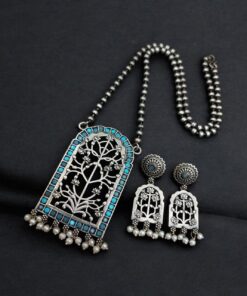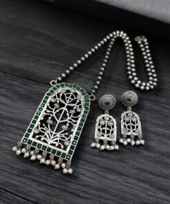 This Antique Floral Art Pendant Set is perfect for those who appreciate the fusion of classic and contemporary designs. Whether paired with ethnic attire for weddings and festive occasions or used to add a touch of sophistication to modern ensembles, this Silver Replica Jewelry is as versatile as it is elegant. The necklace?s adjustable chain ensures a comfortable fit for all necklines, allowing you to customize the length according to your outfit.