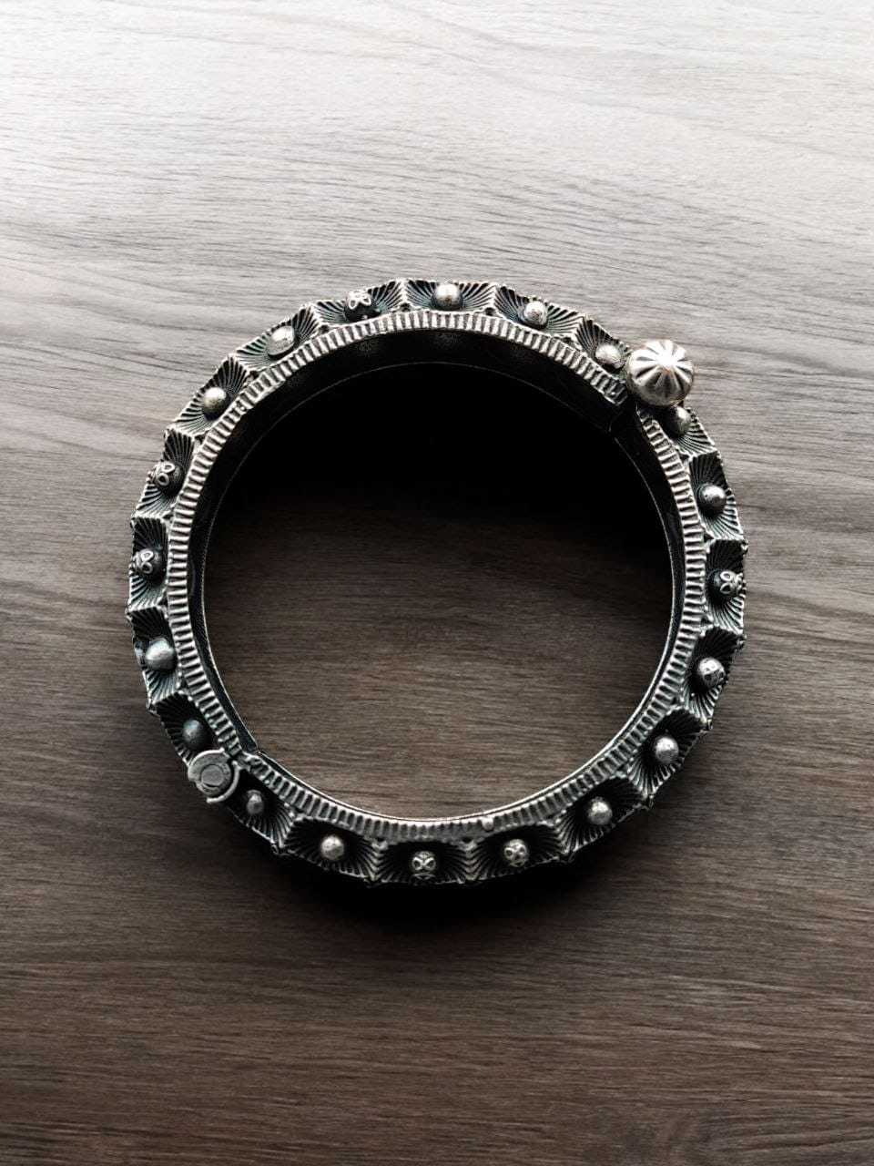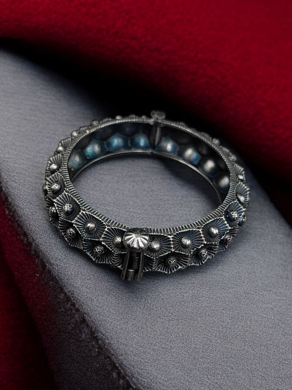 Crafted with intricate detailing, this oxidized kada bracelet showcases a beautiful antique look that instantly captures attention. The bracelet features delicate floral motifs and ornate patterns inspired by traditional Indian artistry, giving it a rich, heritage-inspired appeal. The oxidized silver finish enhances the intricate details, providing a stunning contrast that highlights the beauty of the design. The antique look is further accentuated by the aged silver appearance, making it an eye-catching piece that stands out in any crowd.