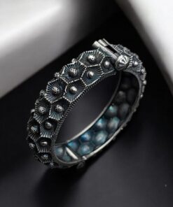 Our Antique Look Oxidised Kada Bracelet is made from high-quality materials to ensure durability and long-lasting wear. The silver replica bangle is crafted using a sturdy metal alloy that mimics the look and feel of real silver, providing an affordable alternative without compromising on quality. The oxidized finish not only adds to its vintage appeal but also ensures that the bracelet maintains its beauty over time, resisting tarnish and wear.