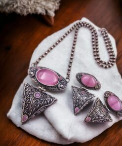 Completing the set are the coordinating earrings, designed to echo the elegance of the pendant. Each earring features a miniature triangle motif, perfectly sized to complement the necklace without overpowering the overall look. With their matching oxidized finish and intricate detailing, the earrings add the perfect finishing touch to the ensemble, creating a cohesive and harmonious look that is both timeless and stylish.