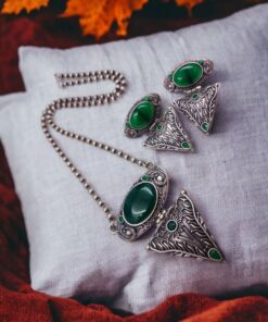 The centerpiece of this Antique silver Look necklace set is the stunning triangle pendant, meticulously crafted to evoke the charm of antique silver. Each angle of the pendant is adorned with intricate detailing, reminiscent of vintage filigree work, adding depth and dimension to the design. The oxidized finish enhances the antique look of the pendant, giving it a rich patina that exudes old-world charm and sophistication.