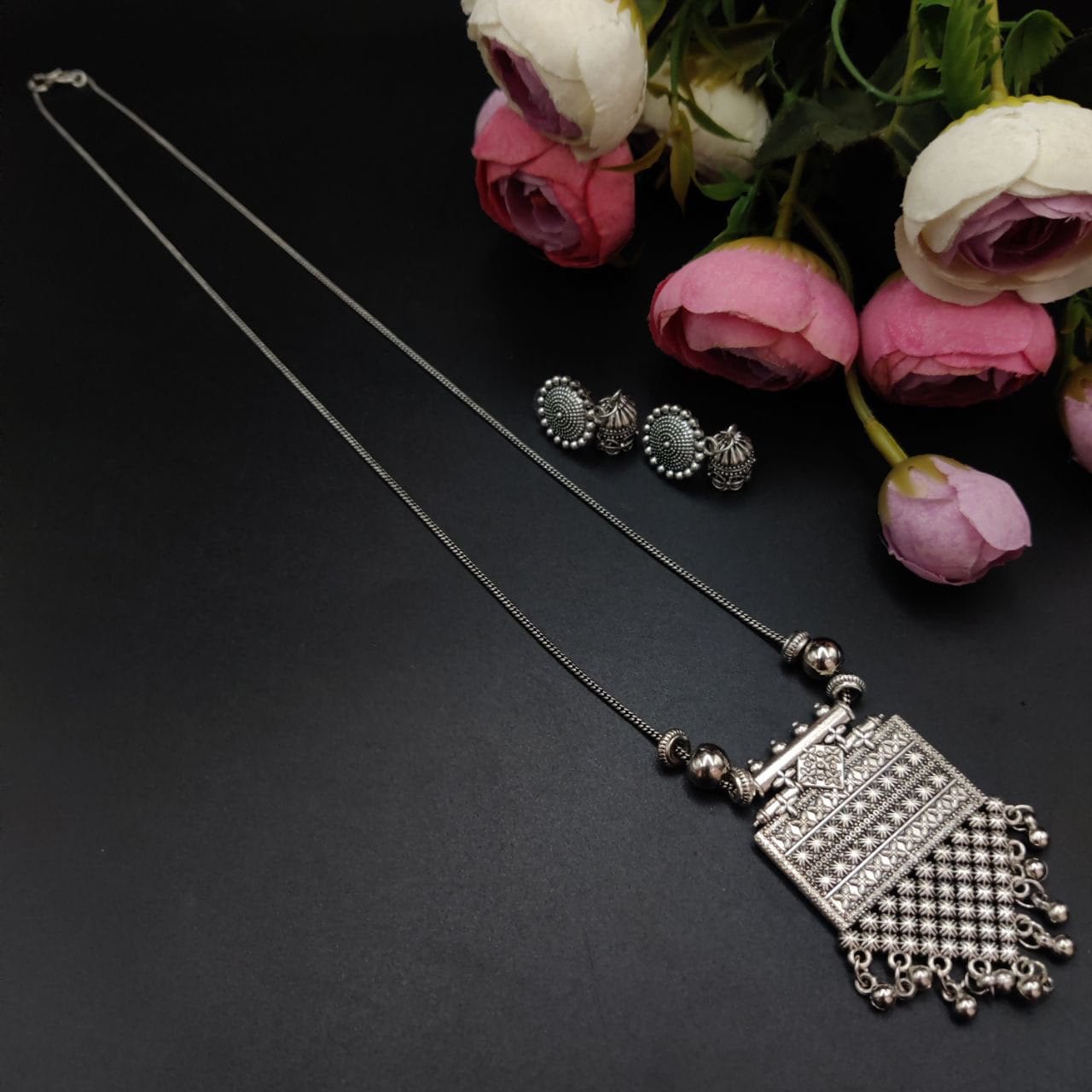 Add a touch of ethnic allure to your ensemble with our Oxidised German Silver Chain Necklace with Jhumka Earrings. Elevate your style and make a statement wherever you go. It also makes a perfect gift for your loved ones who appreciate timeless beauty and traditional craftsmanship. Embrace the elegance and grace of this jewelry set and let it become a cherished part of your collection.
