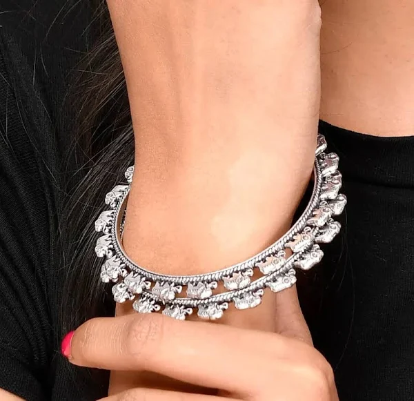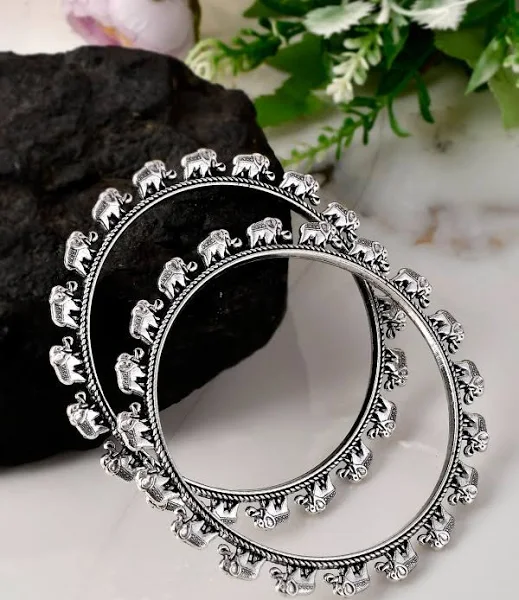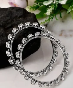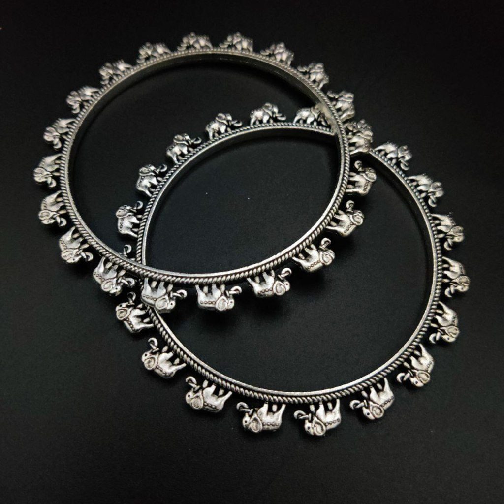 D9creation Presents Bangles collection of Oxidised German Silver Elephant Design Bangle, handcrafted with precision and care. Each piece is a work of art That Represent Indian Touch with Iconic Look.Our Oxidised Bracelets and Bangles are made from high-quality German SIlver materials, ensuring durability and long-lasting beauty. The oxidized finish gives them a unique and distinctive look, with a dark patina that adds depth and character to the jewelry.