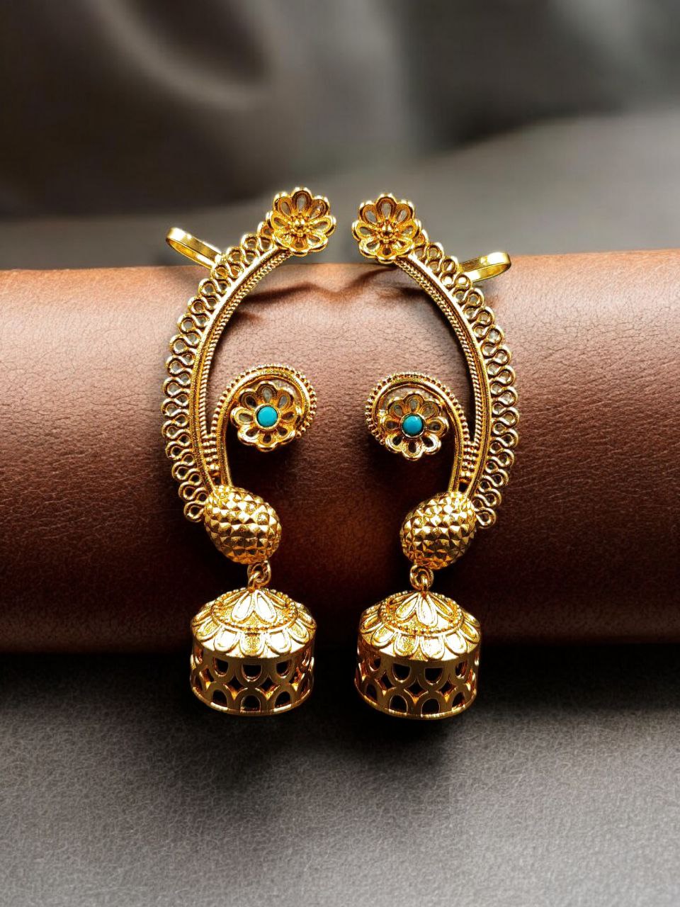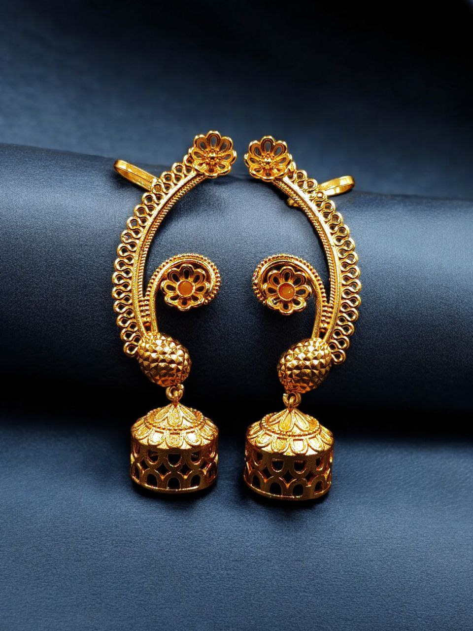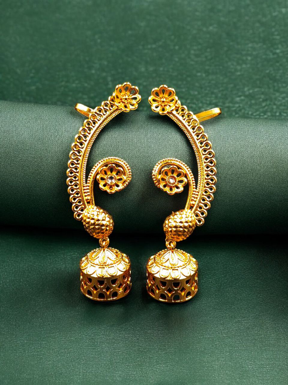 The earcuff features an intricately designed flower motif, symbolizing beauty, grace, and femininity. The floral element sits gracefully on the ear, leading into a traditional jhumka dangler that adds elegant movement and richness to the design. Carefully placed stones enhance the floral detailing, adding subtle sparkle and elevating the overall look. The rich gold plated finish gives the jewelry a luxurious appearance that closely resembles real gold.