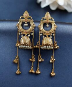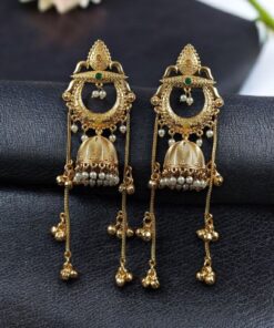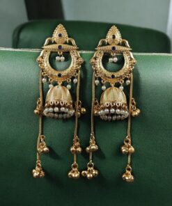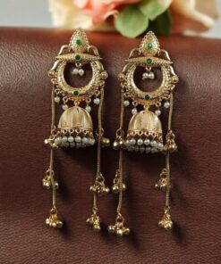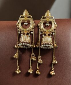 Crafted with a rich premium gold-plated finish, these jhumkas radiate a luxurious shine that instantly enhances your overall look. The intricate sparkling stone embellishments add a glamorous brilliance, while the delicate pearl work detailing creates a graceful and royal charm. Every tiny detail is thoughtfully designed to give you a bold yet elegant ethnic statement.