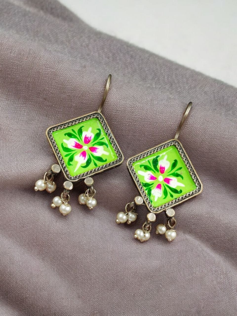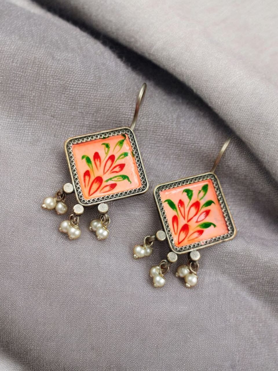 The oxidized silver replica finish gives these Hand-Painted Earrings a vintage and rustic appeal, reminiscent of treasured family heirlooms. The darkened tones of the silver create a striking contrast with the vibrant hand-painted designs, enhancing their visual appeal. This finish not only adds to the aesthetic value of the earrings but also ensures their durability, allowing you to enjoy their beauty for years to come.