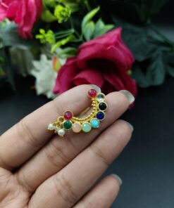Step into the spotlight with grace and tradition. The Handcrafted Gold Plated Nosepin with Stone and Pearl Detailing is not just a piece of jewelry; it?s a reflection of your heritage, taste, and elegance.