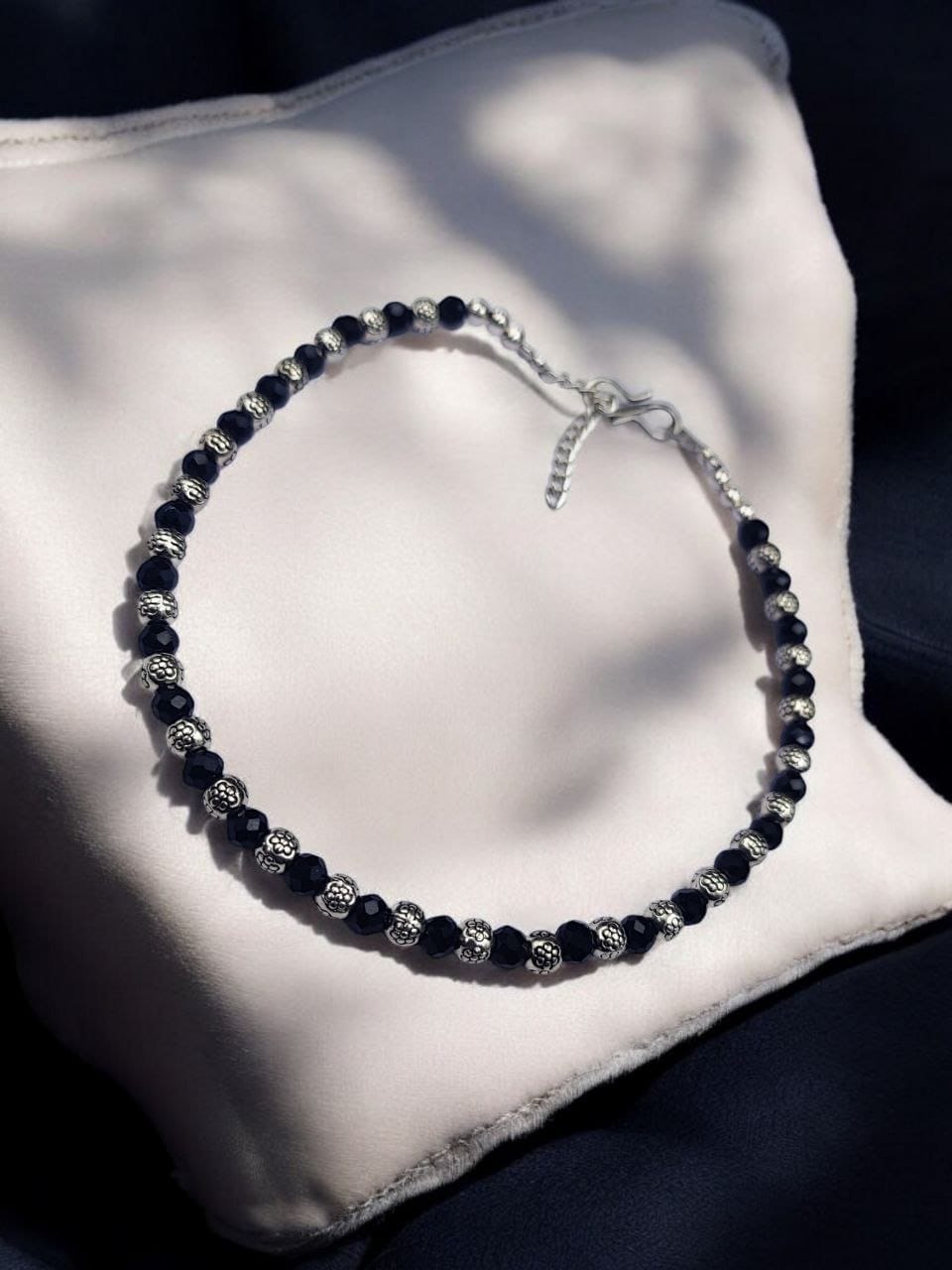 Crafted with precision, this Stone Beads Anklet features high-quality crystal stone beads that shimmer beautifully under light, offering a subtle yet captivating allure. The beads are intricately arranged along a delicate chain, providing a lightweight feel and a graceful aesthetic. Its silver-like polish gives it a timeless and trendy vibe, making it an ideal choice for daily wear jewelry.