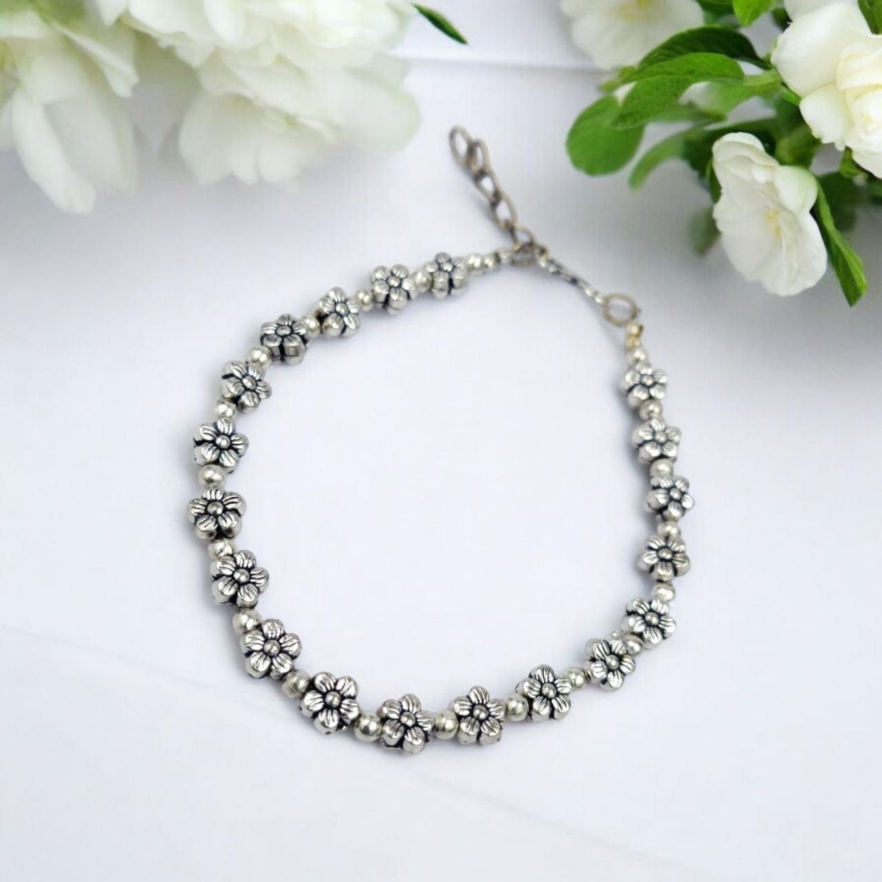 Discover the perfect blend of traditional craftsmanship and contemporary design with our Designer Flower Beads Bracelet in Oxidized German Silver. This exquisite Oxidized German Silver Bracelet is a stunning addition to any jewelry collection, offering a unique and elegant accessory for both everyday wear and special occasions.