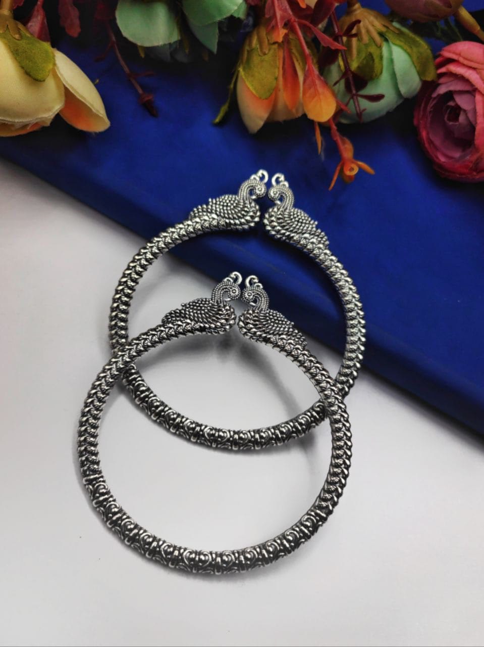 Introducing our German Silver collection of Oxidised Peacock Bangles Design, handcrafted by D9creation. Each piece is a work of art, Our Oxidised Bracelets and Bangles are made from high-quality German Silver materials, ensuring durability and long-lasting beauty. The oxidized finish gives them a unique and distinctive look, with a dark patina that adds depth and character to the jewelry.