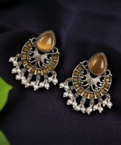 These brass Monalisa stone earrings feature intricate detailing and a polished finish, giving them a luxurious appeal. The finely cut Monalisa stones sparkle beautifully, making these earrings an elegant choice for traditional wear. The ethnic brass earrings are lightweight yet durable, ensuring long-lasting shine and comfort.