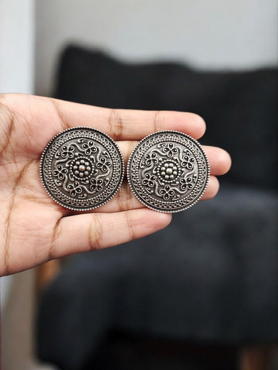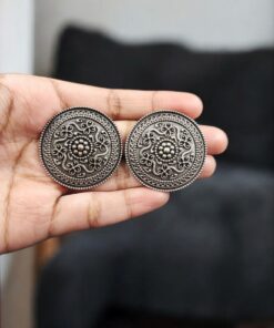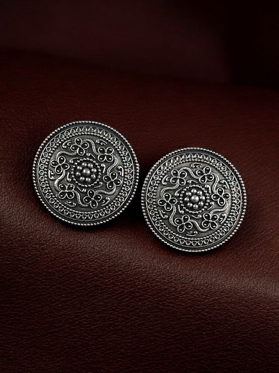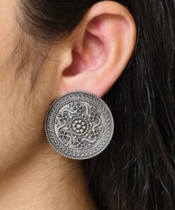 The earrings feature finely detailed floral art motifs, inspired by classic Indian craftsmanship. Each curve and petal is carefully designed to create a soft yet eye-catching look. The oxidized finish enhances the detailing, giving the earrings a rich antique appearance that closely resembles real silver jewelry. This vintage-inspired charm makes them a versatile accessory for both traditional and modern outfits.