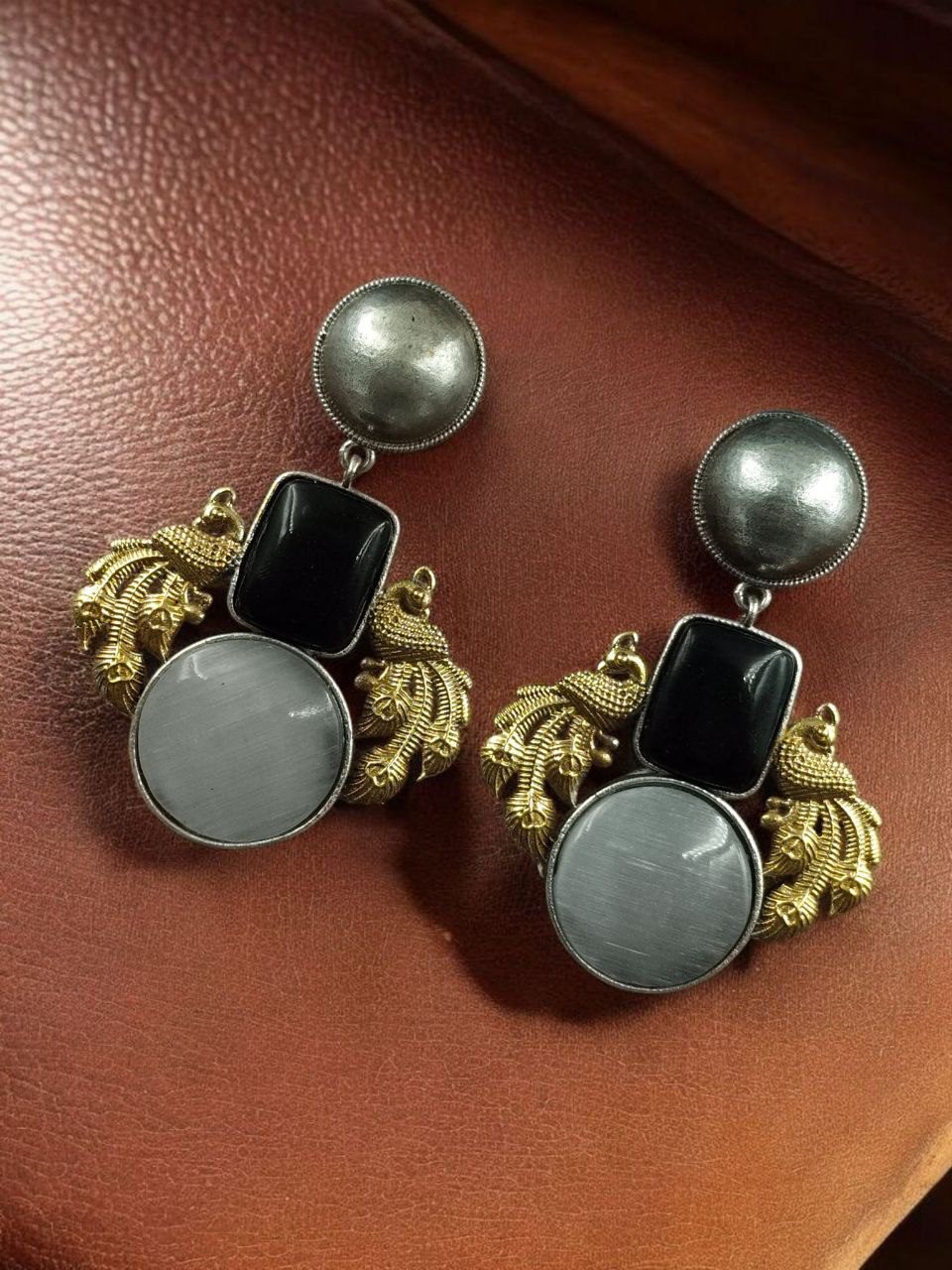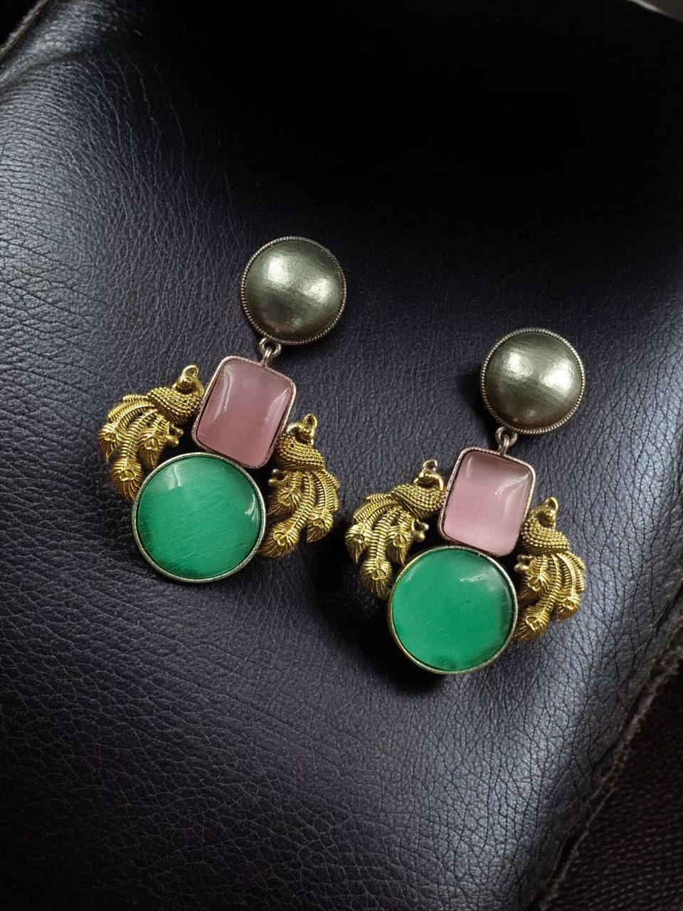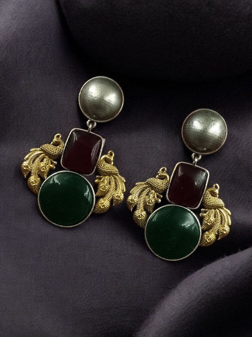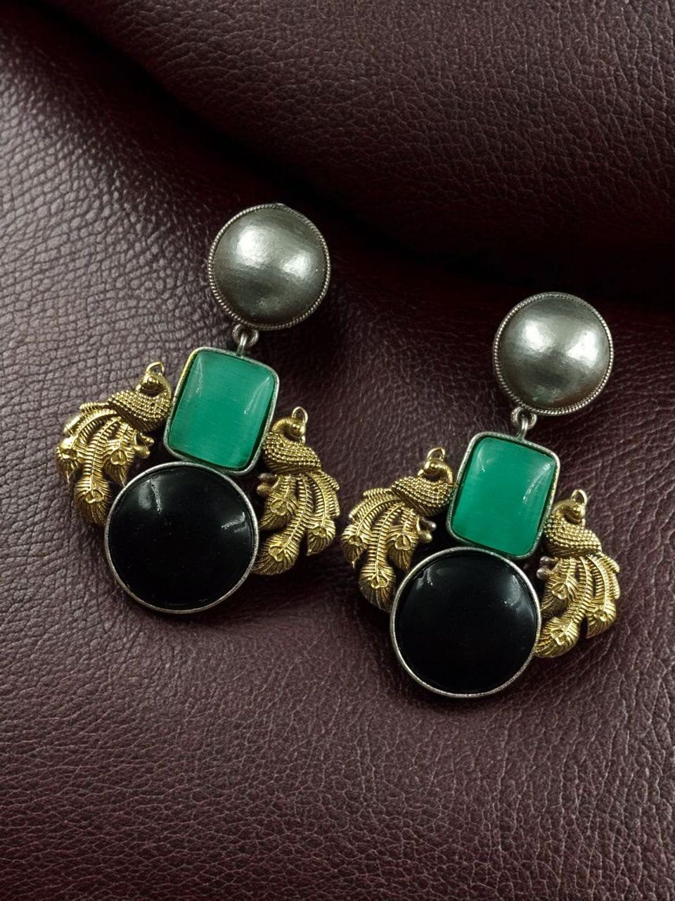 Elegant Peacock-Inspired Two-Tone Brass Earrings with Monalisa Stone ? A Contemporary Choice for Every Occasion