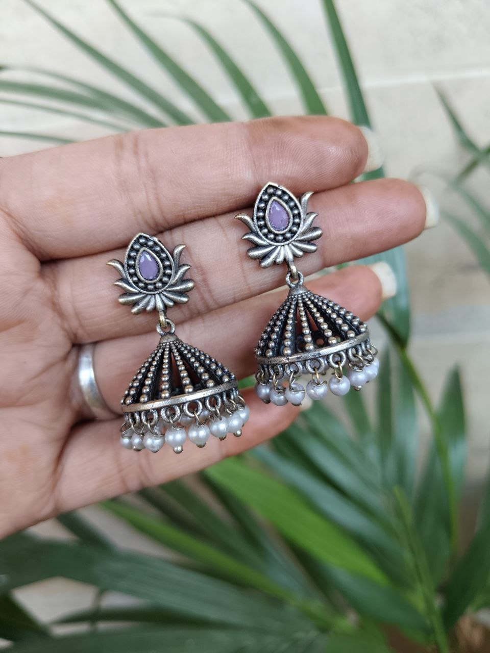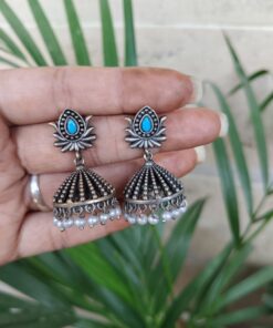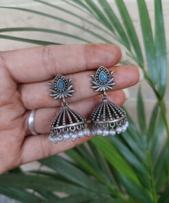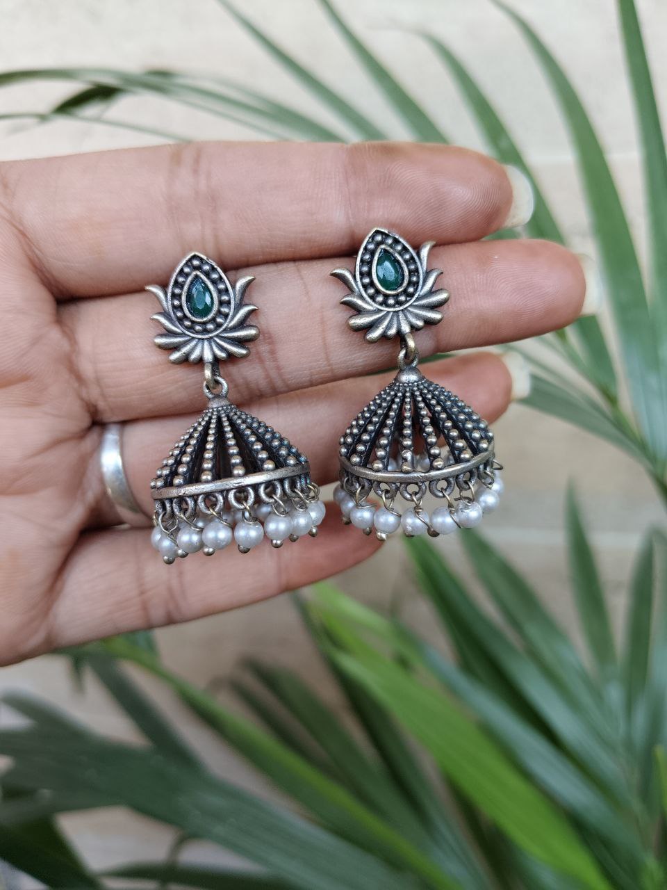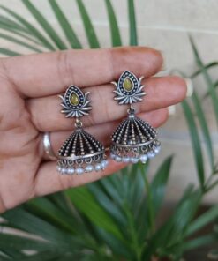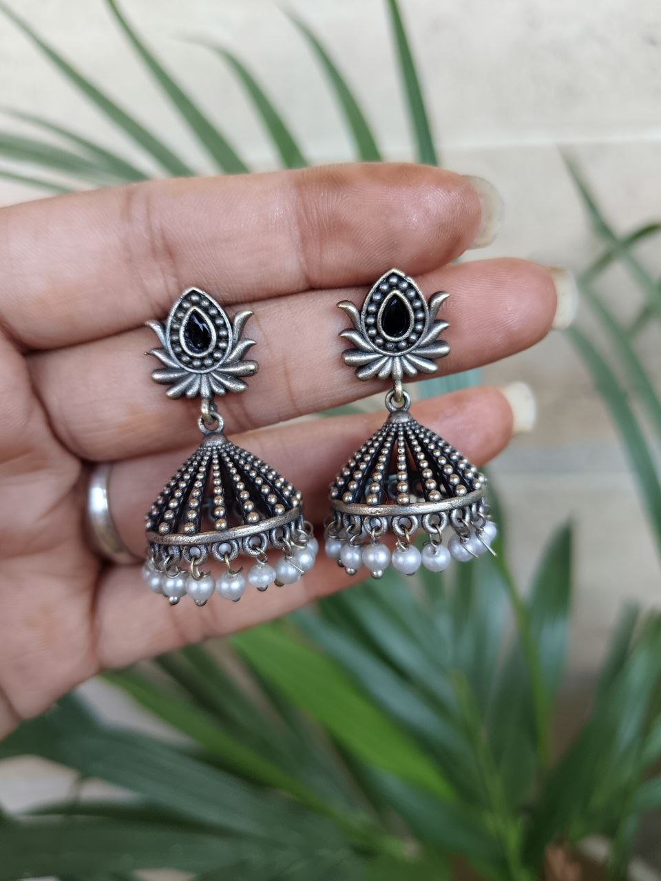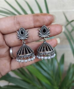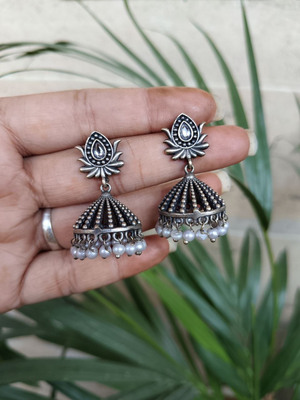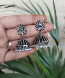 The silver lotus jhumka is a perfect blend of traditional elegance and contemporary grace. Inspired by the sacred lotus motif, this beautifully crafted earring symbolizes purity, beauty, and cultural richness. Designed for women who love ethnic jewelry with a refined touch, this piece adds a graceful statement to any outfit, whether it is festive, traditional, or casual wear.