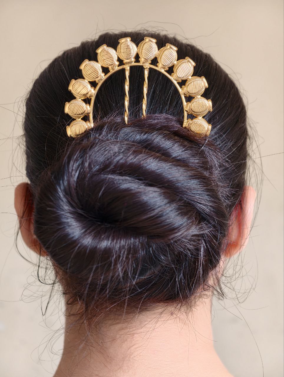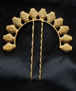 Versatile in styling, this ethnic gold plated juda pin suits women of all age groups. You can style it with a classic low bun for a traditional look or pair it with a modern bun or braided hairstyle for a fusion appearance. Its elegant yet subtle design allows it to be worn as a statement piece or combined with other hair accessories for a more elaborate festive style.
