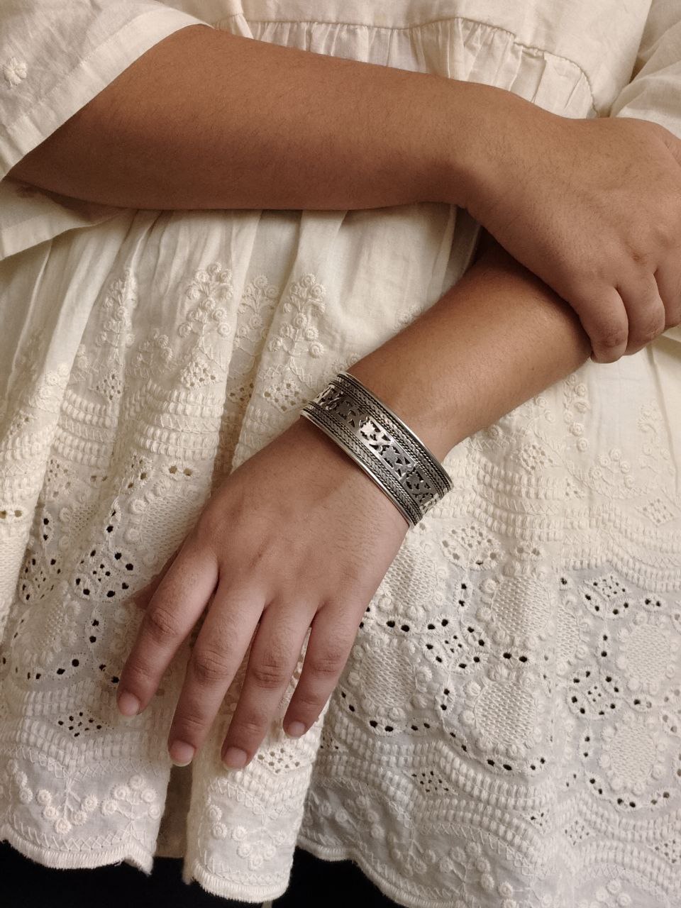 The bracelet features an intricate ethnic pattern, carefully handcrafted to highlight fine detailing and timeless Indian craftsmanship. Every curve and engraved motif adds depth and richness, making this cuff bracelet a true designer piece. The premium silver plated finish enhances its shine while giving it the luxurious appearance of real silver jewelry without the heavy weight or high maintenance.