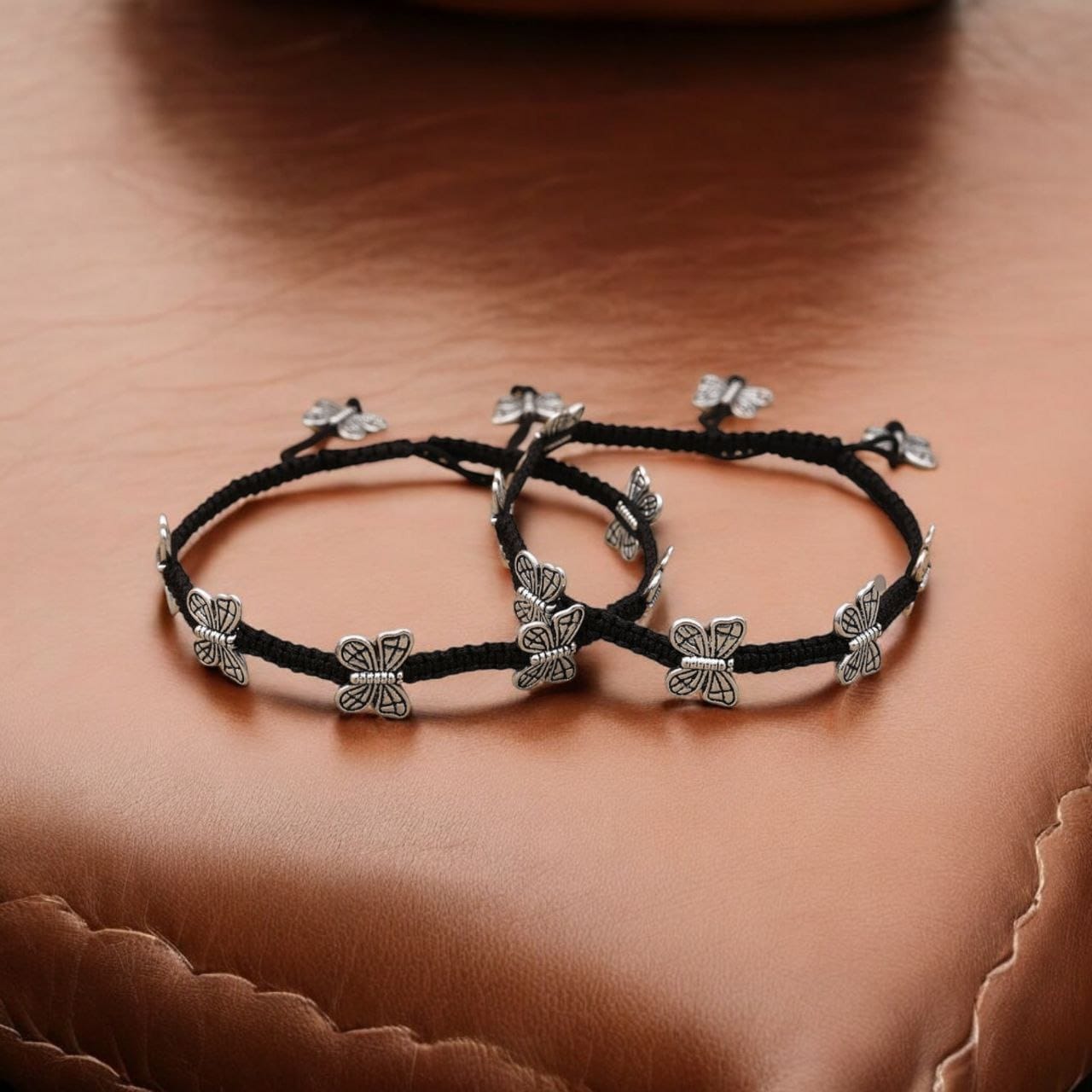 Elevate your accessory game with this exquisite German Silver Butterfly Anklet, a perfect blend of elegance and versatility. Designed for the modern woman, this trendy payal features intricately crafted butterfly charms made from premium-quality German silver, paired with an adjustable thread for a personalized fit.