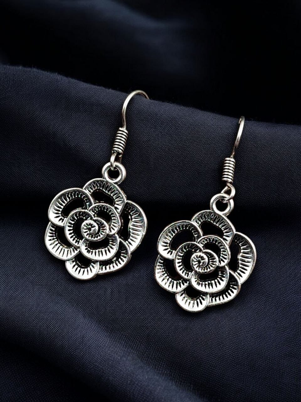 Crafted from high-quality?German silver, these earrings feature an intricate floral design that symbolizes grace and femininity. The detailed craftsmanship is enhanced by an oxidized finish, giving the earrings a vintage-inspired look that pairs beautifully with both ethnic and modern attire. The lightweight construction ensures a comfortable fit, while the secure hook-style closure offers ease of wear and stability.