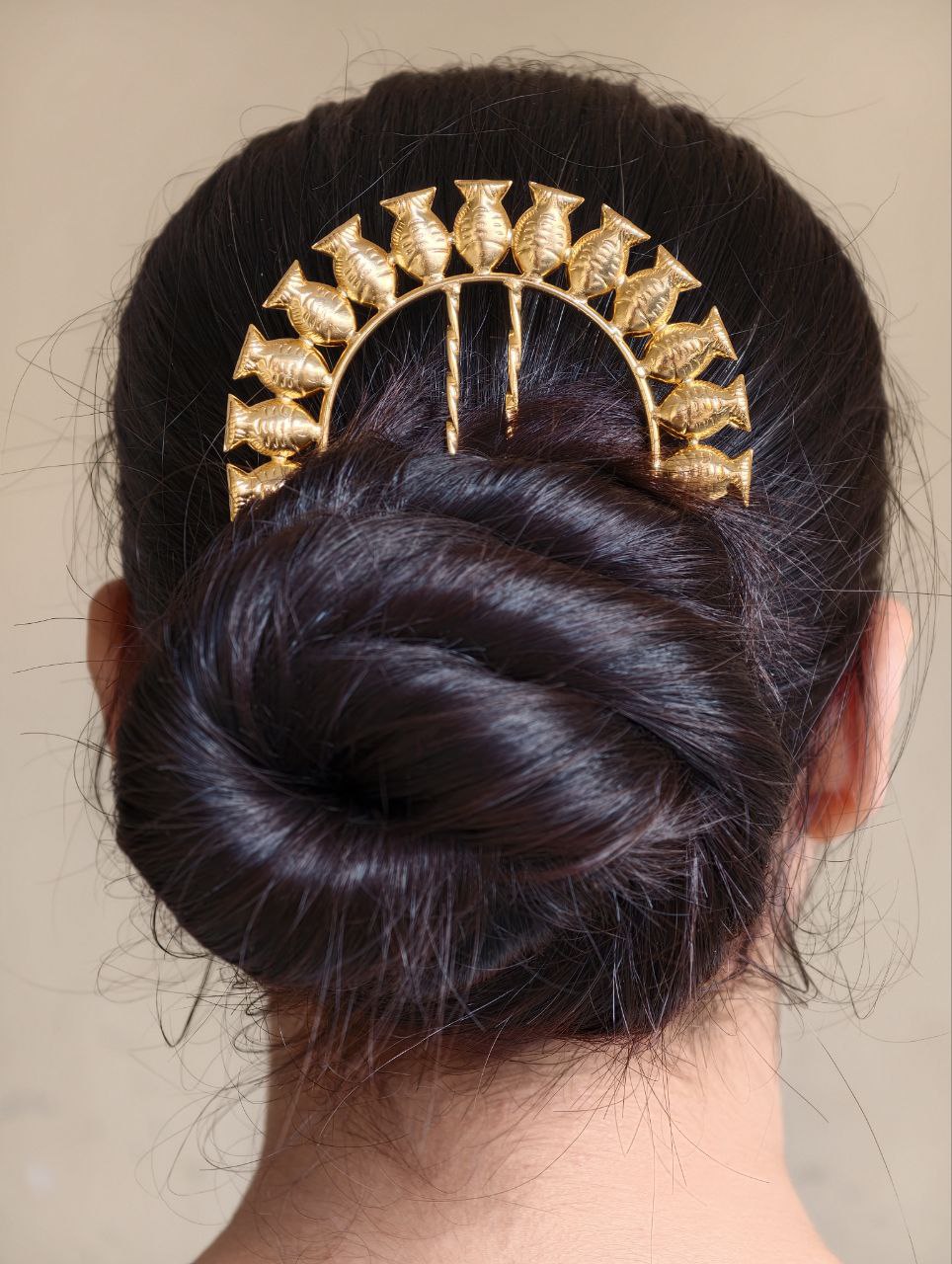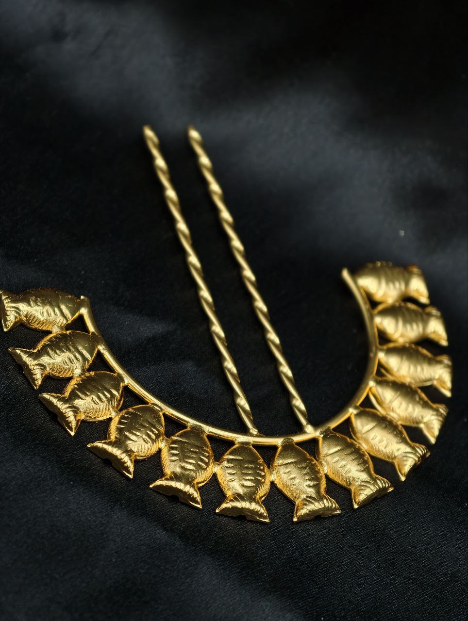 The premium gold plated finish gives this Fish Design Juda Pin a rich, radiant shine that enhances the intricate fish design. The detailing is carefully crafted to highlight the curves and form of the motif, creating a balanced look that feels elegant without being heavy. Whether styled with sarees, lehengas, salwar suits, or Indo-western outfits, this hair accessory adds a sophisticated finishing touch to your overall appearance.