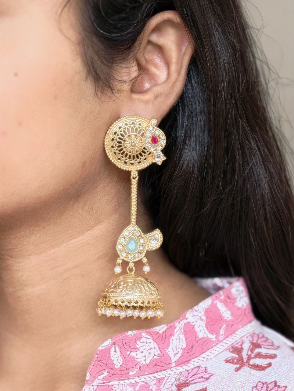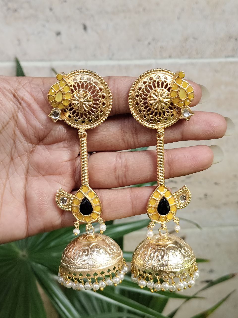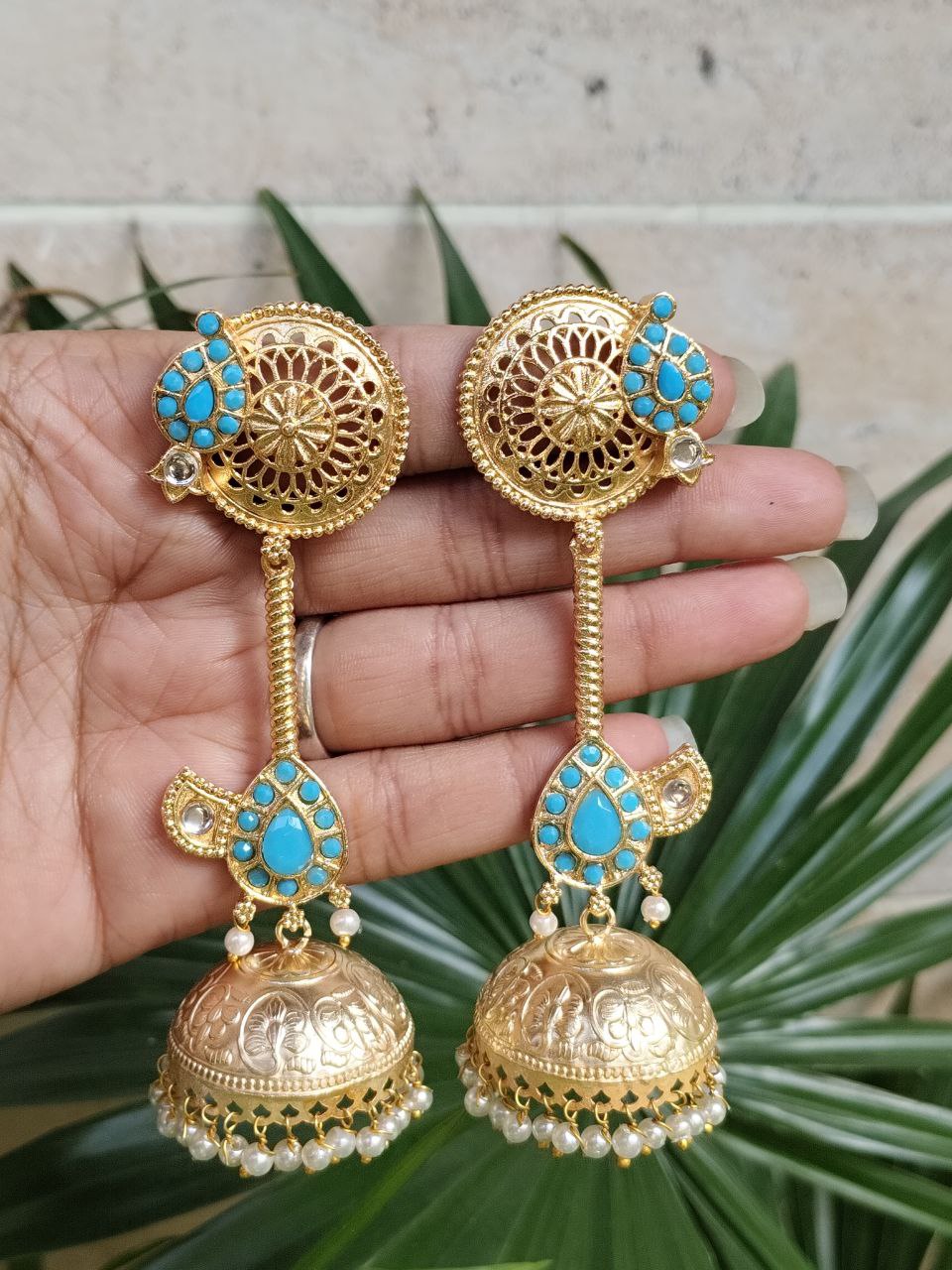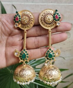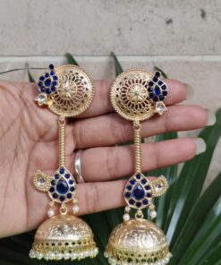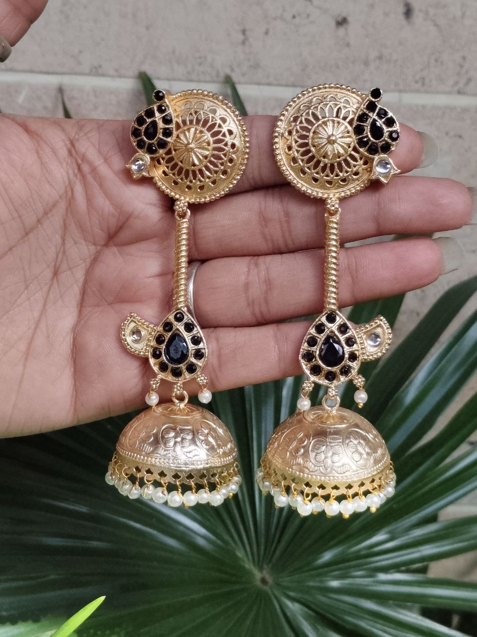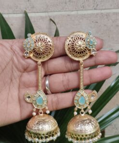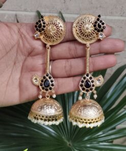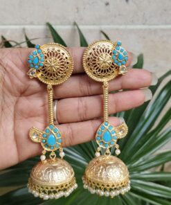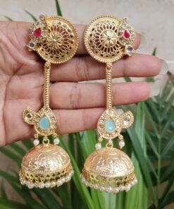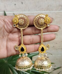 Crafted from high-quality brass and finished with premium gold plating, these jhumka earrings offer durability along with a luxurious shine. The detailed craftsmanship highlights delicate patterns that create a refined and elegant look. The gold plated finish gives the earrings a rich and radiant appearance, making them a perfect accessory for traditional attire like sarees, lehengas, and salwar suits, as well as Indo-western outfits.