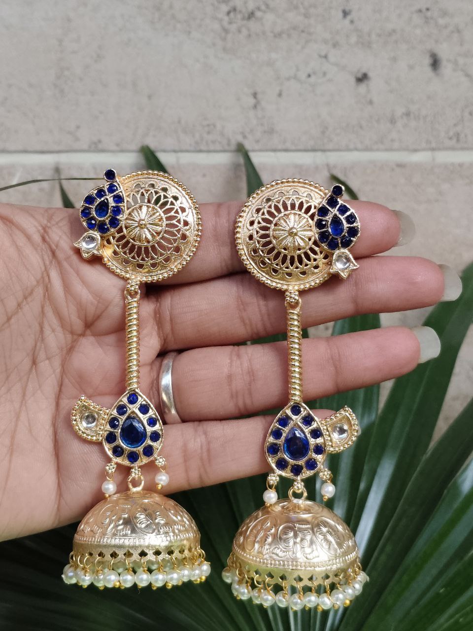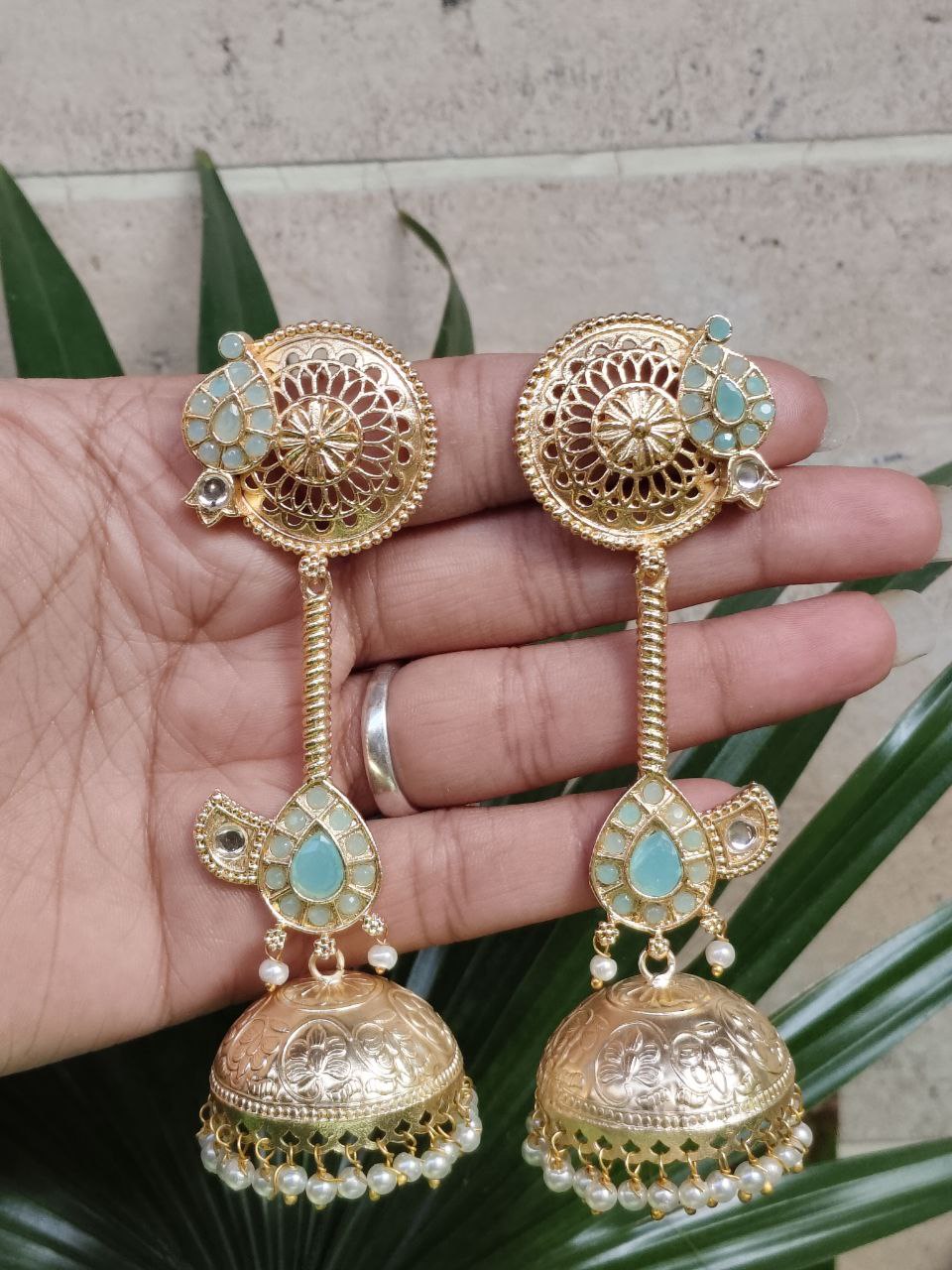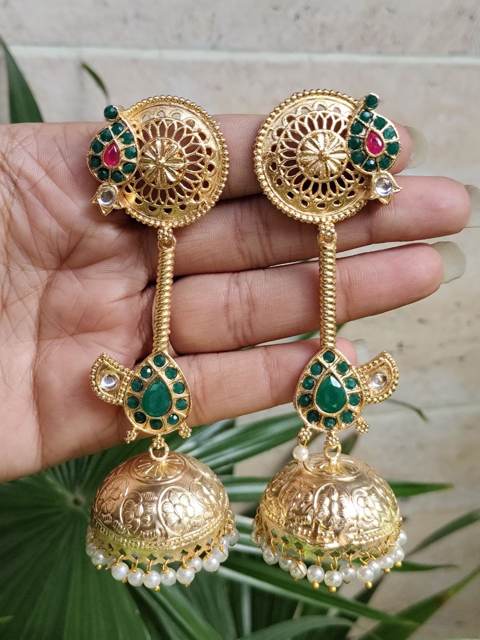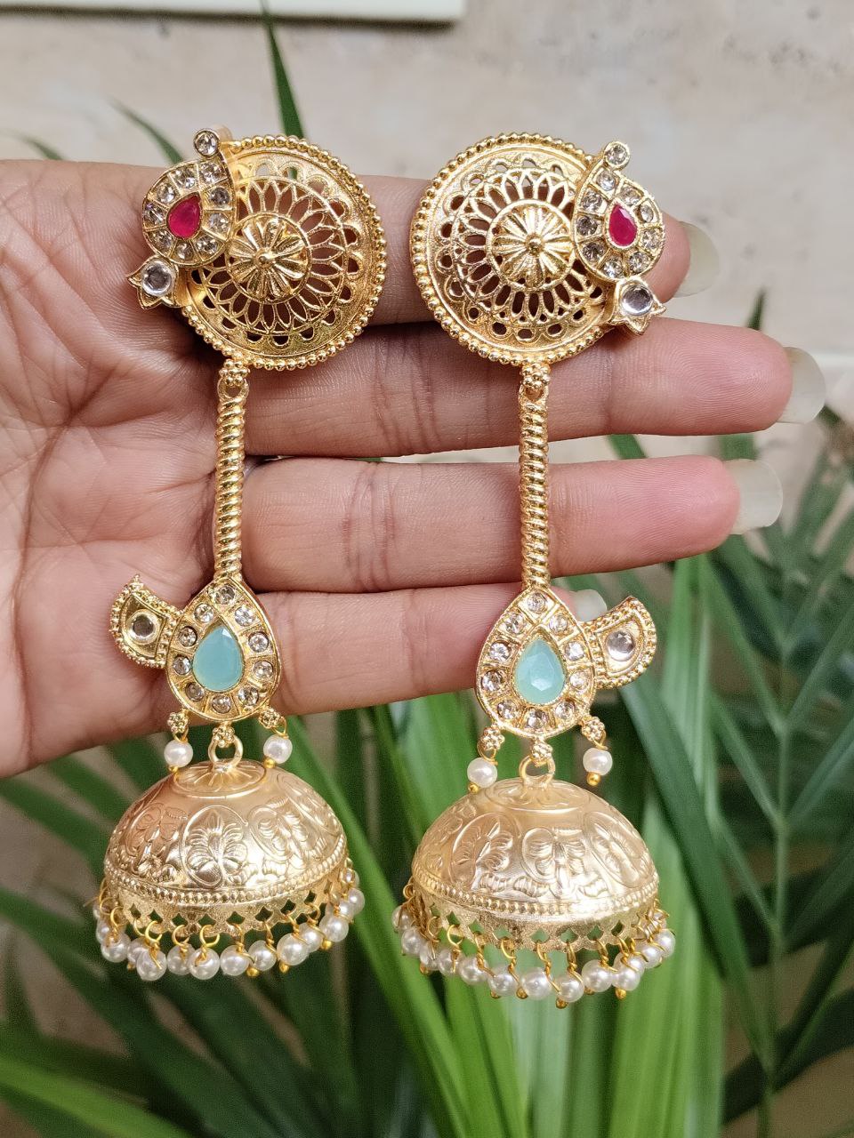 Crafted from high-quality brass and finished with premium gold plating, these jhumka earrings offer durability along with a luxurious shine. The detailed craftsmanship highlights delicate patterns that create a refined and elegant look. The gold plated finish gives the earrings a rich and radiant appearance, making them a perfect accessory for traditional attire like sarees, lehengas, and salwar suits, as well as Indo-western outfits.