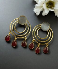 Crafted with care, these earrings feature a classic round shape that flatters all face types. The intricate design is beautifully accented with a sparkling Monalisa stone at the center, which adds a soft, luminous glow to the piece. The warm tones of the stone blend perfectly with the rich gold-plated finish, creating a radiant and graceful effect.