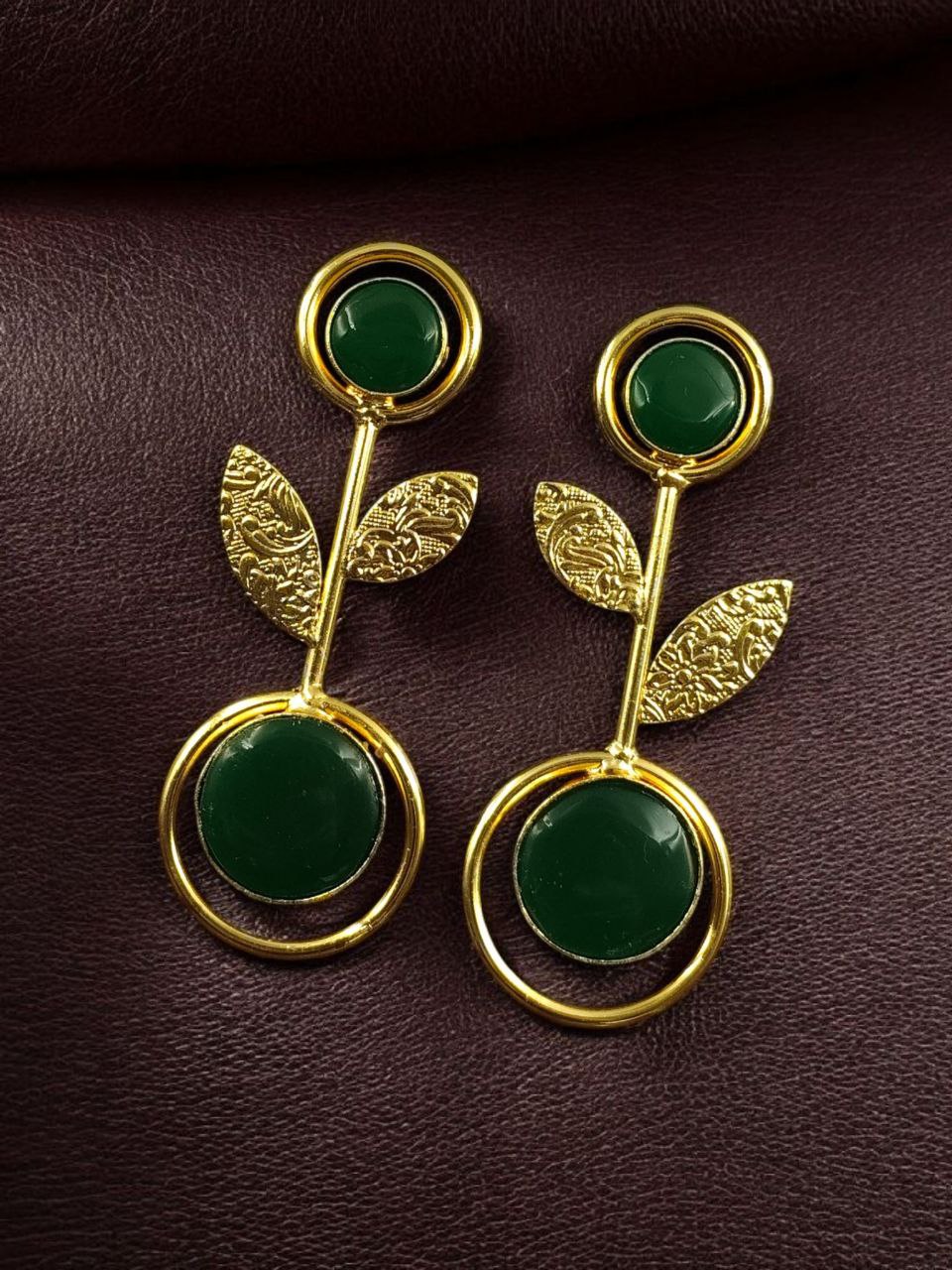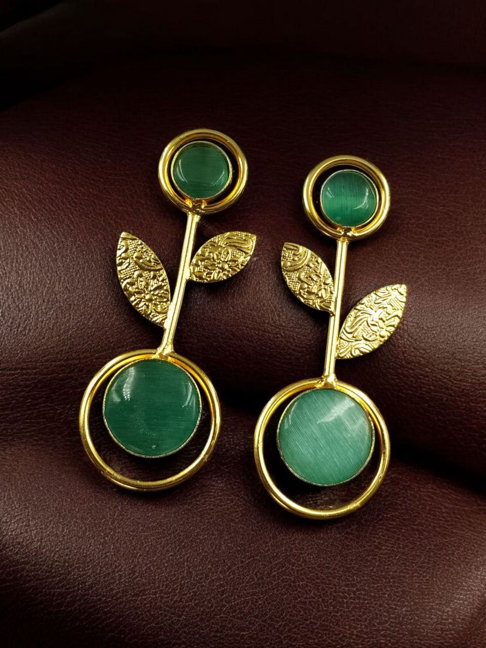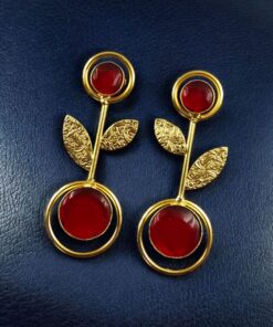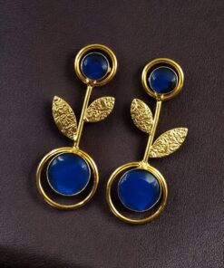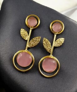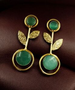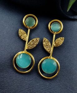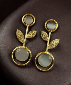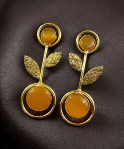 Bring timeless beauty and a modern edge to your collection with these Gold Plated Western Look Earrings, crafted with a perfect blend of ethnic charm and contemporary elegance. Designed with floral art detailing and adorned with shimmering Monalisa stones, these earrings feature a unique leaf design set gracefully within a circle pattern, making them stand out as a versatile piece for every occasion.