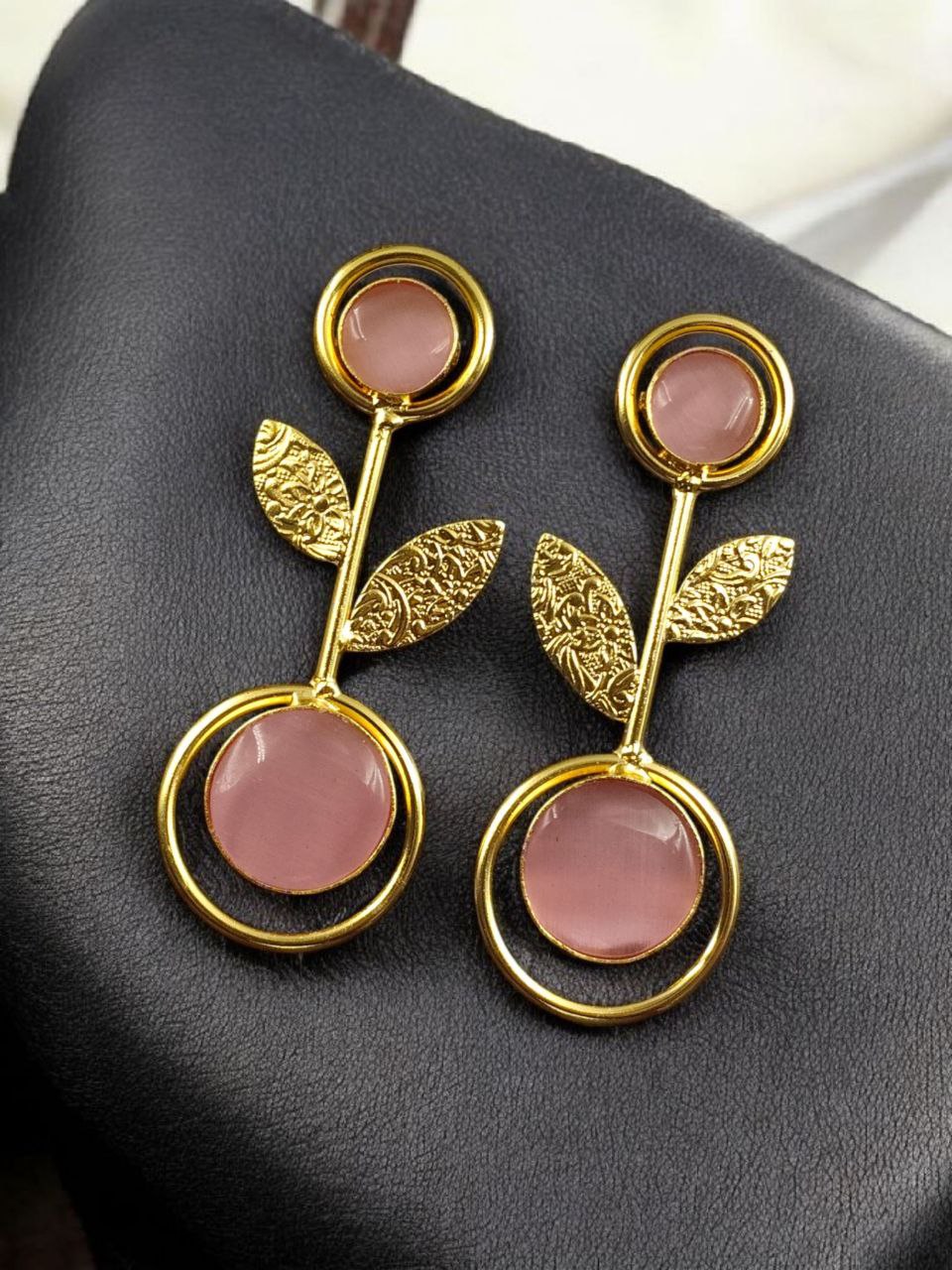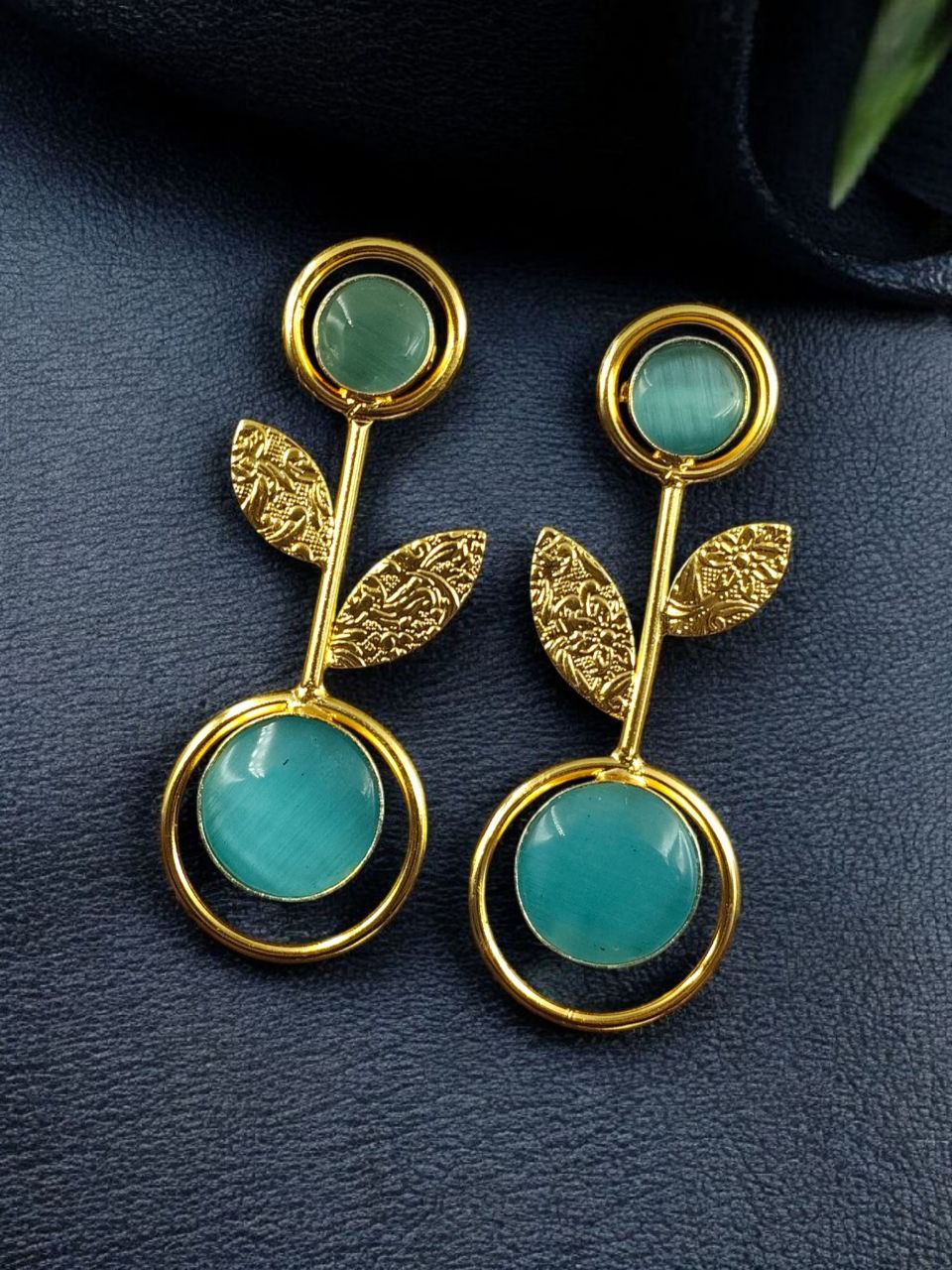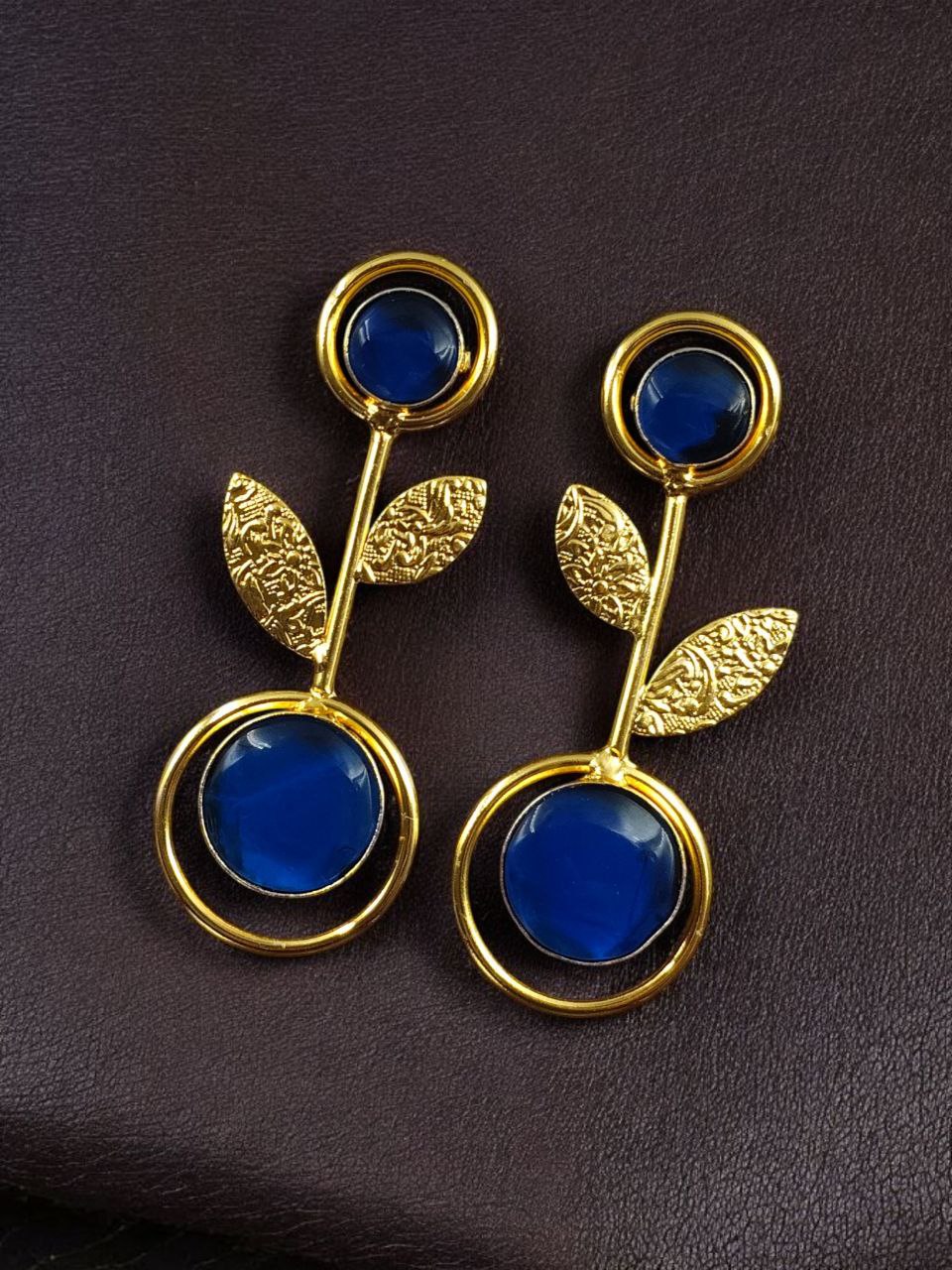 Bring timeless beauty and a modern edge to your collection with these Gold Plated Western Look Earrings, crafted with a perfect blend of ethnic charm and contemporary elegance. Designed with floral art detailing and adorned with shimmering Monalisa stones, these earrings feature a unique leaf design set gracefully within a circle pattern, making them stand out as a versatile piece for every occasion.