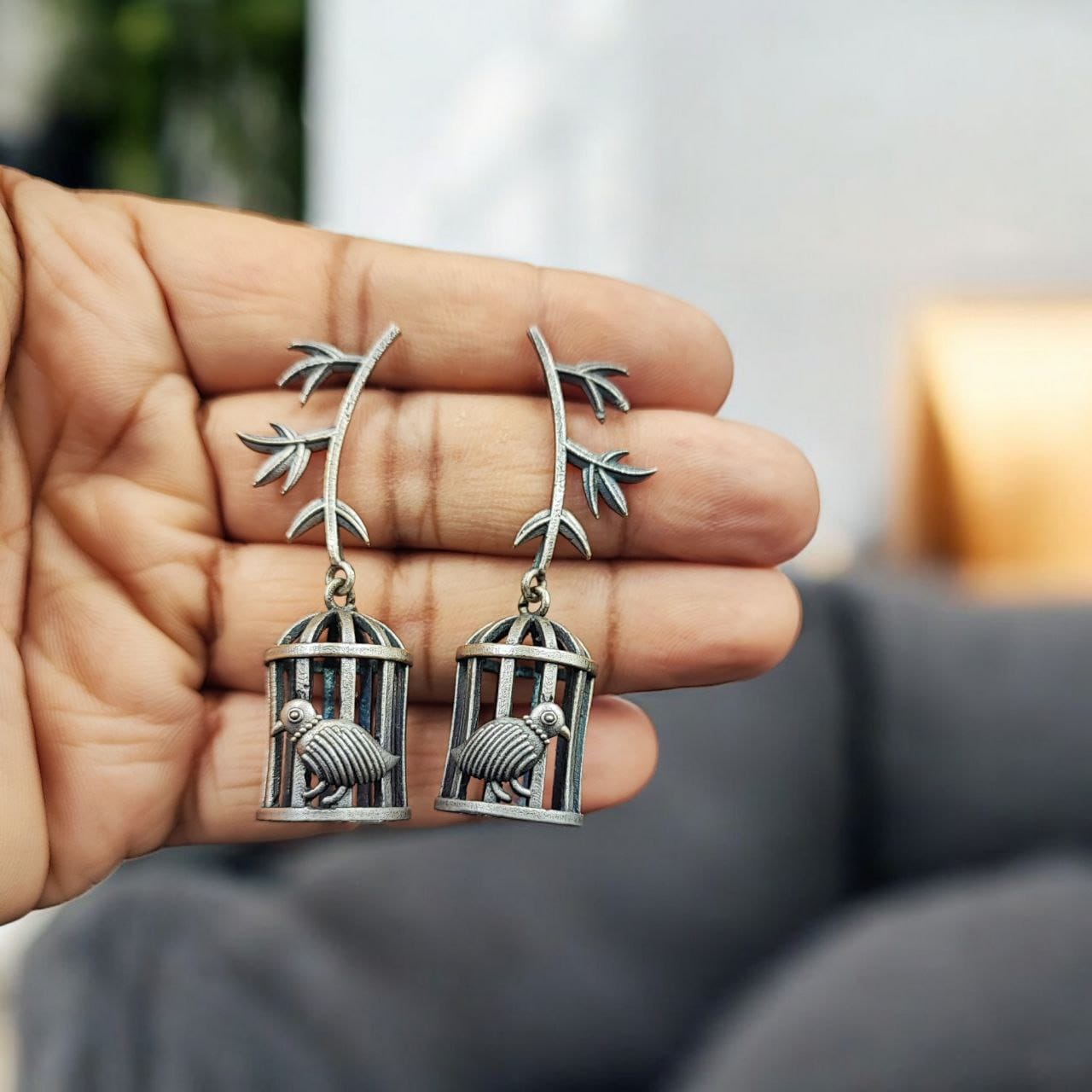 Crafted with precision, these handmade bird cage jhumkas are designed to capture the beauty of traditional jewelry while offering a contemporary touch. The oxidized silver finish enhances the antique look, making them an ideal choice for lovers of traditional jhumka earrings. The delicate cage design symbolizes freedom and beauty, making these earrings more than just an accessory?they tell a story of grace and elegance.