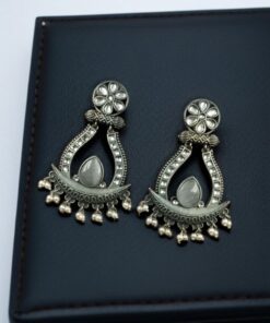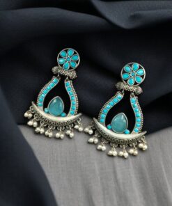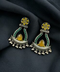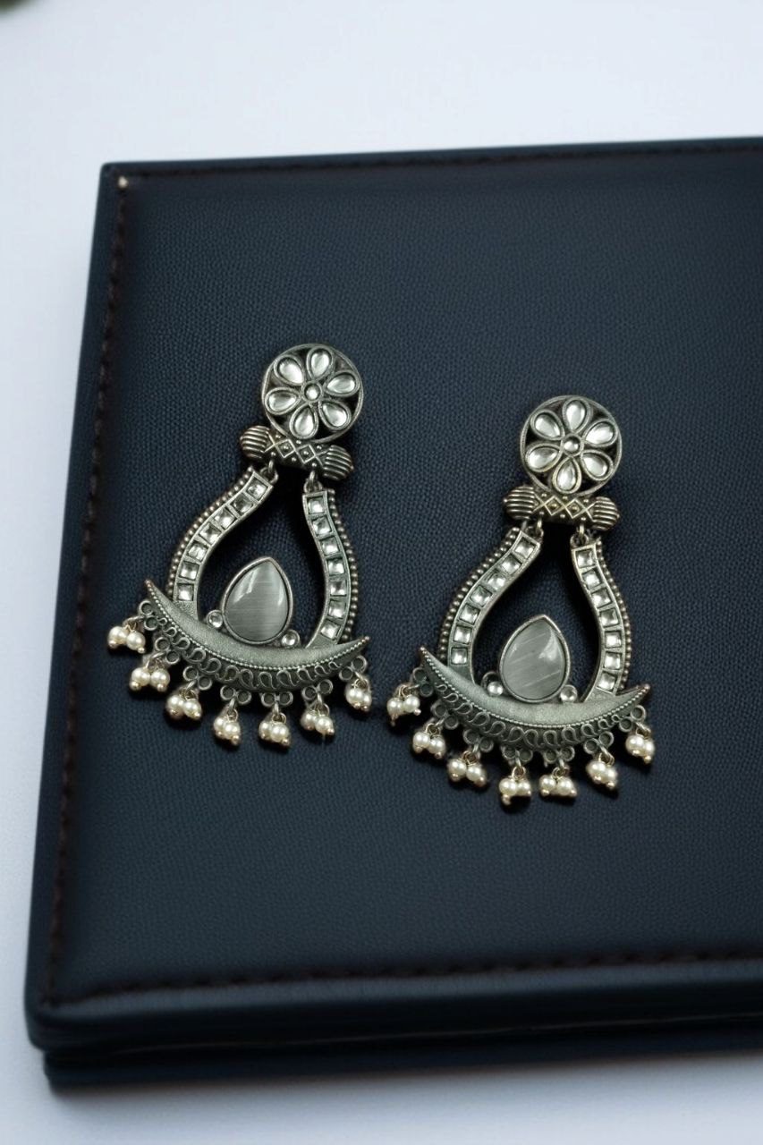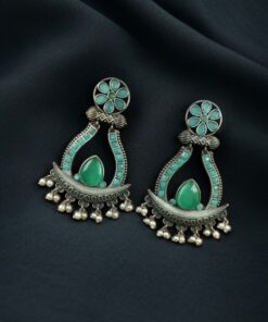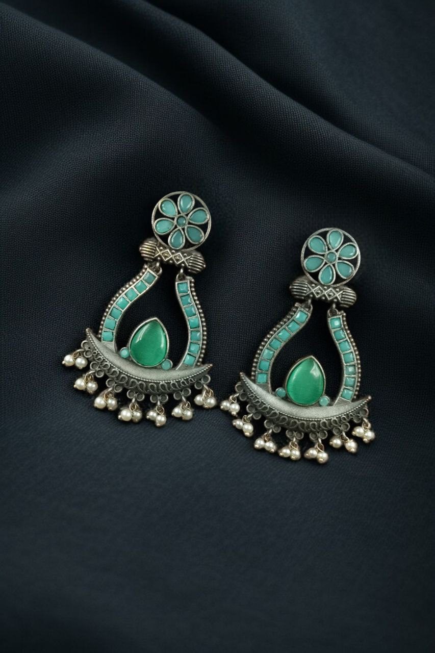 The highlight of these Oxidized Long Earrings is the graceful placement of Monalisa stones, known for their elegant glow and smooth texture, paired beautifully with delicate pearl drops that sway gently with movement. This thoughtful combination enhances the overall appeal, giving you a regal yet versatile accessory you can wear with sarees, lehengas, kurtas, or even Indo-western ensembles.