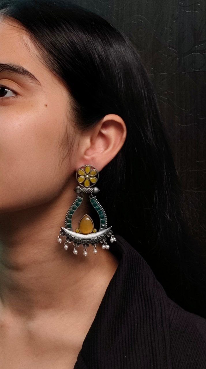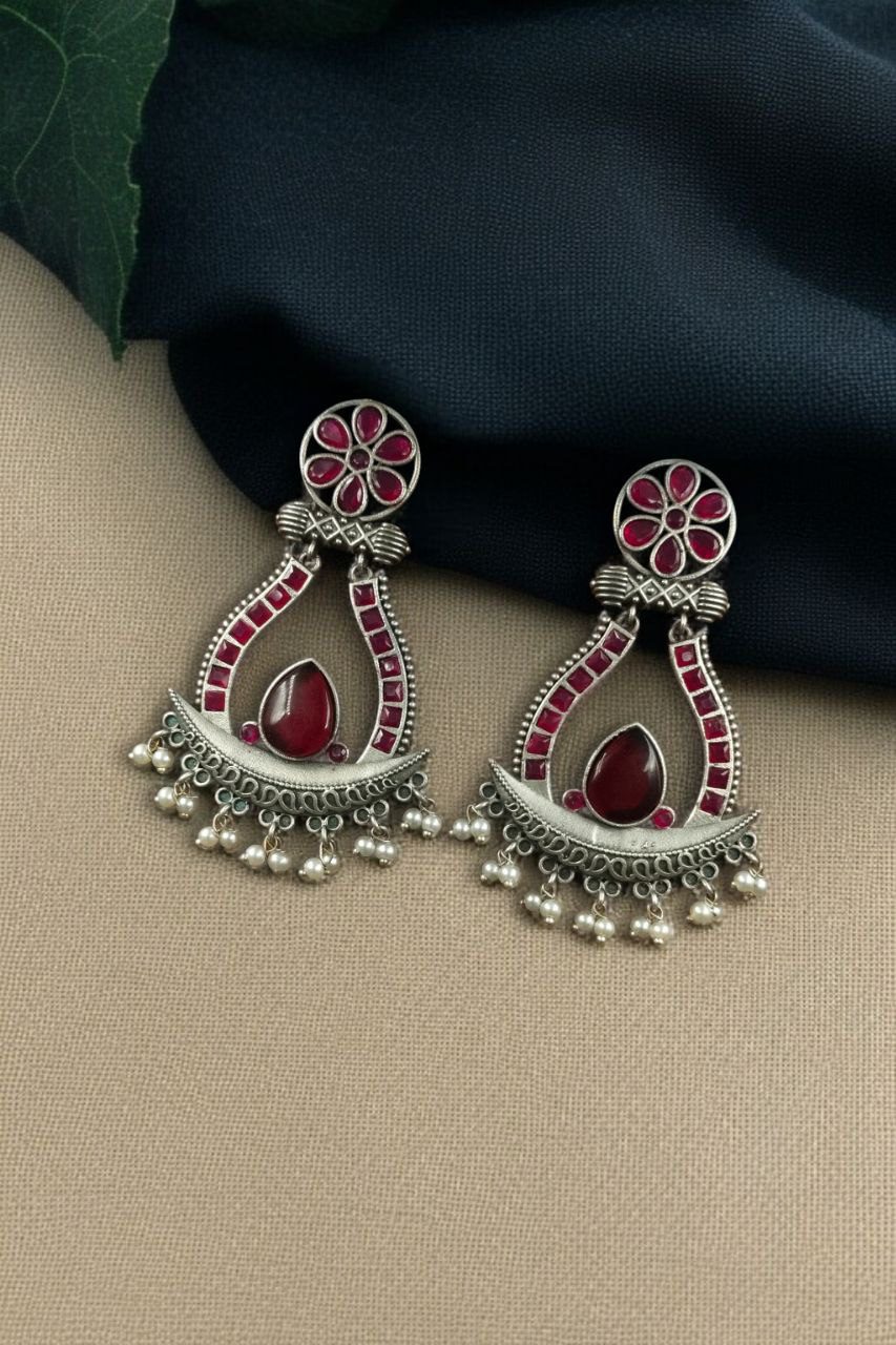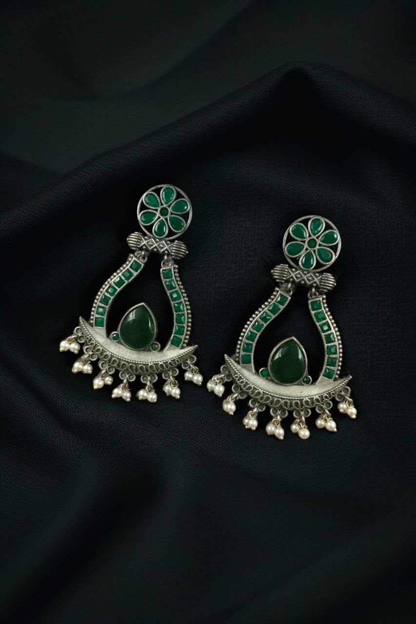 Elevate your jewelry collection with the timeless charm of our Handcrafted Silver Replica Oxidized Long Earrings ? a perfect fusion of traditional elegance and modern flair. These statement dangler earrings are thoughtfully designed with a blend of Monalisa stones and lustrous pearl accents, creating an eye-catching accessory that seamlessly complements both ethnic and contemporary outfits.