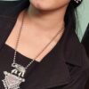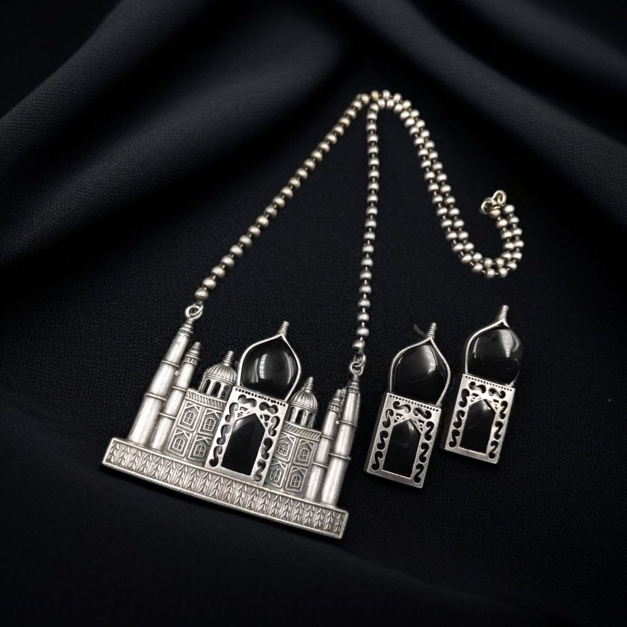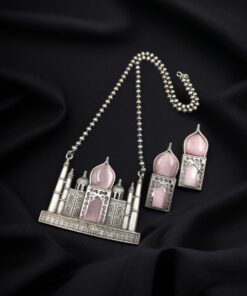 This necklace set showcases intricate detailing, featuring a beautifully handcrafted Taj Mahal-inspired pendant adorned with delicate engravings. The oxidized silver finish enhances its vintage appeal, while the Monalisa stone accents add a touch of regal charm. The accompanying matching earrings complete the set, making it a statement piece that exudes sophistication.