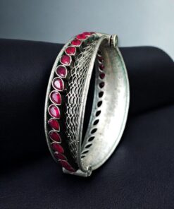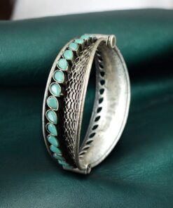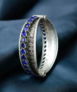 The handcrafted design highlights intricate patterns enhanced by carefully placed stones that add subtle sparkle and depth. The oxidized silver replica finish gives the bangle an antique-inspired appeal, making it a standout piece for ethnic and fusion styling. Each detail is thoughtfully created to ensure the bangle looks elegant without being overly heavy or flashy.