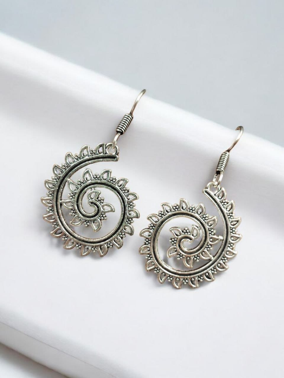 Our earrings are designed with a keen eye for detail and a deep appreciation for timeless beauty. The unique design showcases intricate patterns that are enhanced by the oxidized silver plating, giving them a striking, antique look. The delicate craftsmanship ensures that each earring is a piece of art, with every detail meticulously worked to perfefction. The oxidized finish adds depth and character, making these earrings stand out while maintaining a subtle elegance.