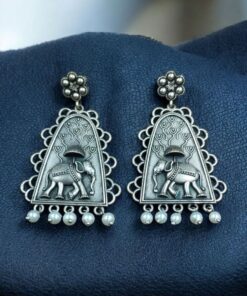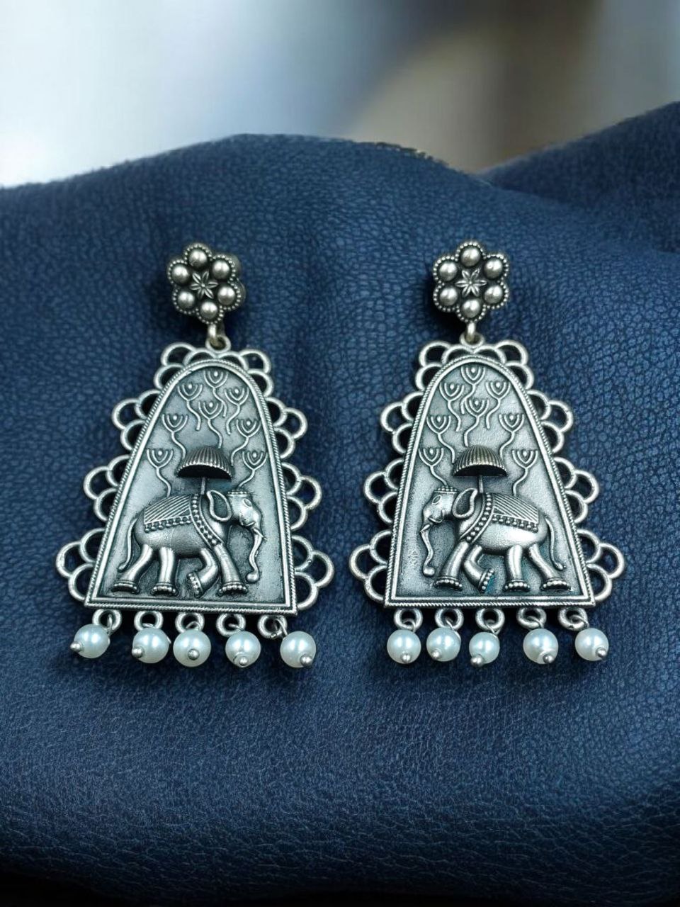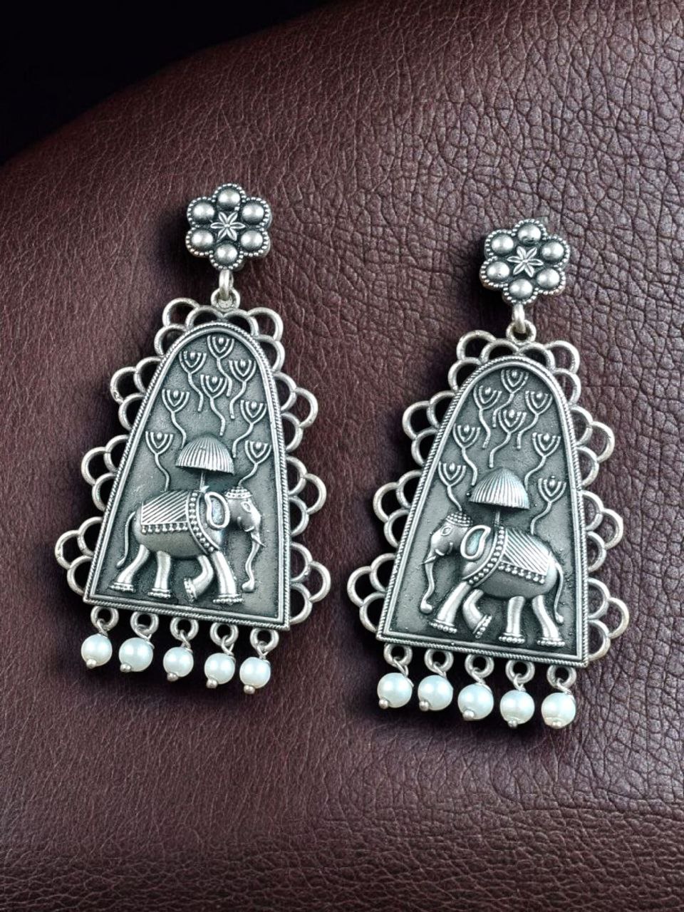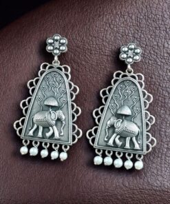 Crafted with care from premium-quality materials, these earrings feature a stunning oxidized silver finish that gives them a vintage and classy appeal. The delicate pearl embellishments at the bottom add a graceful touch, enhancing the overall look with subtle shimmer. Despite their artistic length, these Elephant Dangler Earrings are lightweight and comfortable, making them ideal for all-day wear without any discomfort.