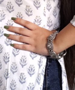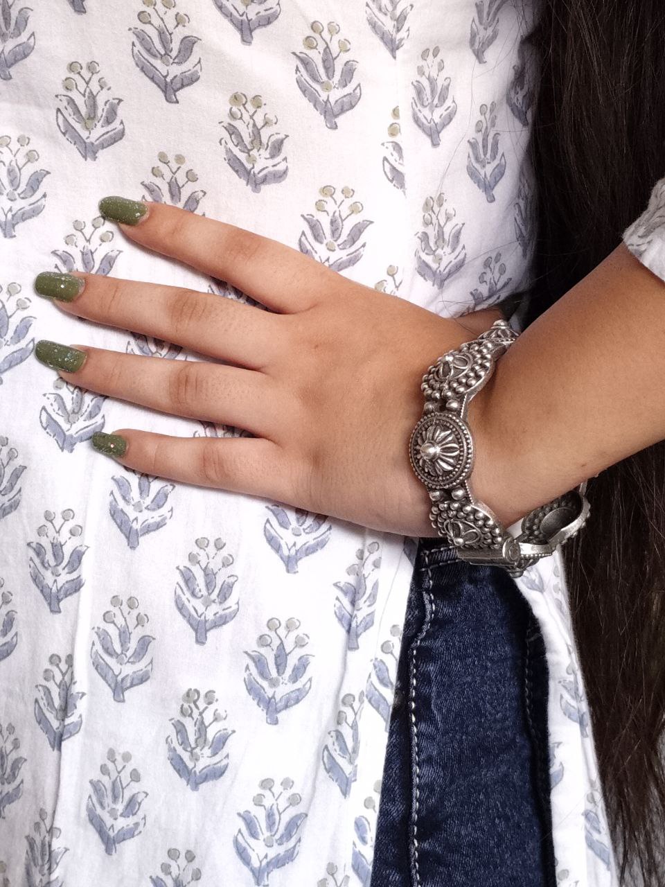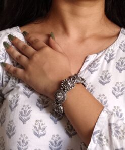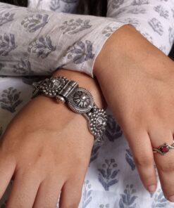 “Unveil sophistication with our Luxurious Oxidised Bangle – a striking silver look-alike free size Kada that epitomizes elegance. Crafted with precision, this exquisite piece exudes timeless allure and versatility. Elevate your style effortlessly with the captivating charm of our oxidised bangle, perfect for any occasion. Indulge in the luxurious appeal of oxidised silver without compromising on quality or style. Make a statement with this versatile accessory that adds a touch of glamour to your ensemble. Discover the perfect blend of tradition and modernity with our meticulously crafted oxidised bangle, designed to complement your unique personality and elevate your fashion game. Elevate your look with our Luxurious Oxidised Bangle – your go-to accessory for timeless elegance and impeccable style.”