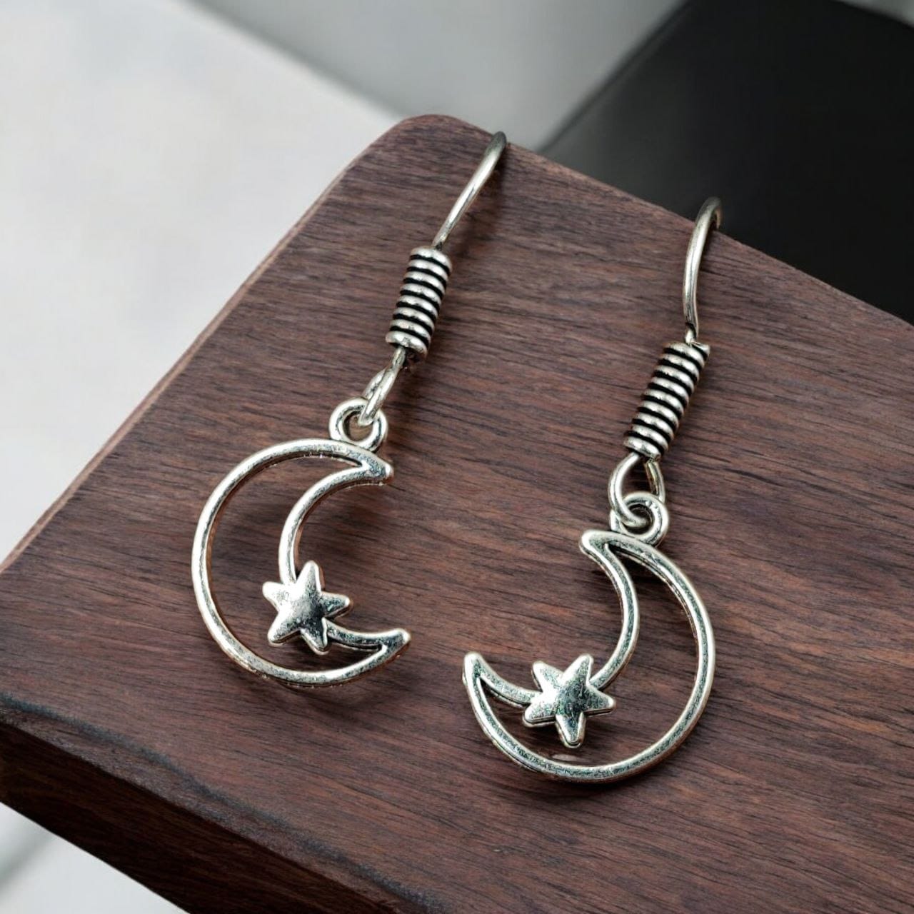 The Moon and Star motif represents the beauty of the night sky, symbolizing dreams, aspirations, and a connection to the cosmos. The earrings feature an intricately designed crescent moon paired with a sparkling star, creating a delicate yet striking combination that is sure to catch attention. The German silver finish adds a touch of vintage allure while ensuring durability, making these earrings a must-have for anyone with a love for celestial-inspired jewelry.