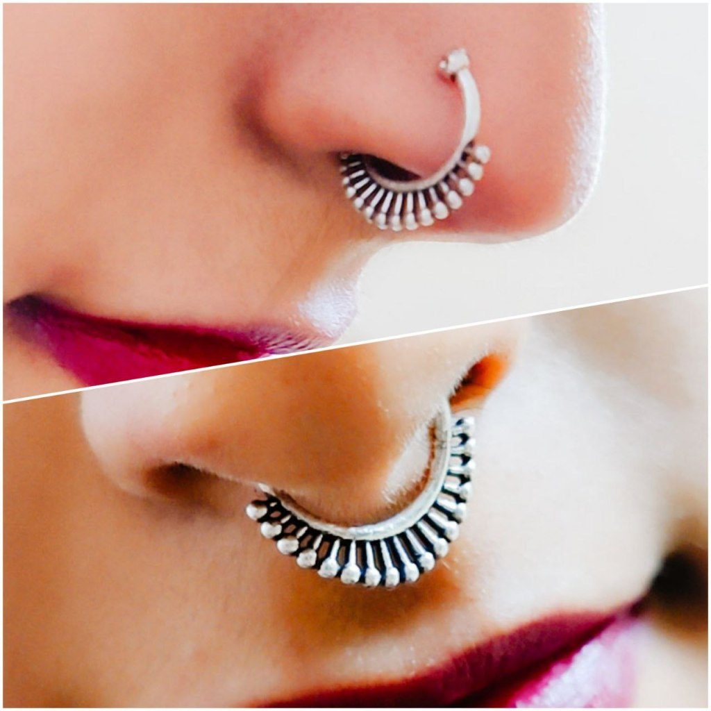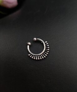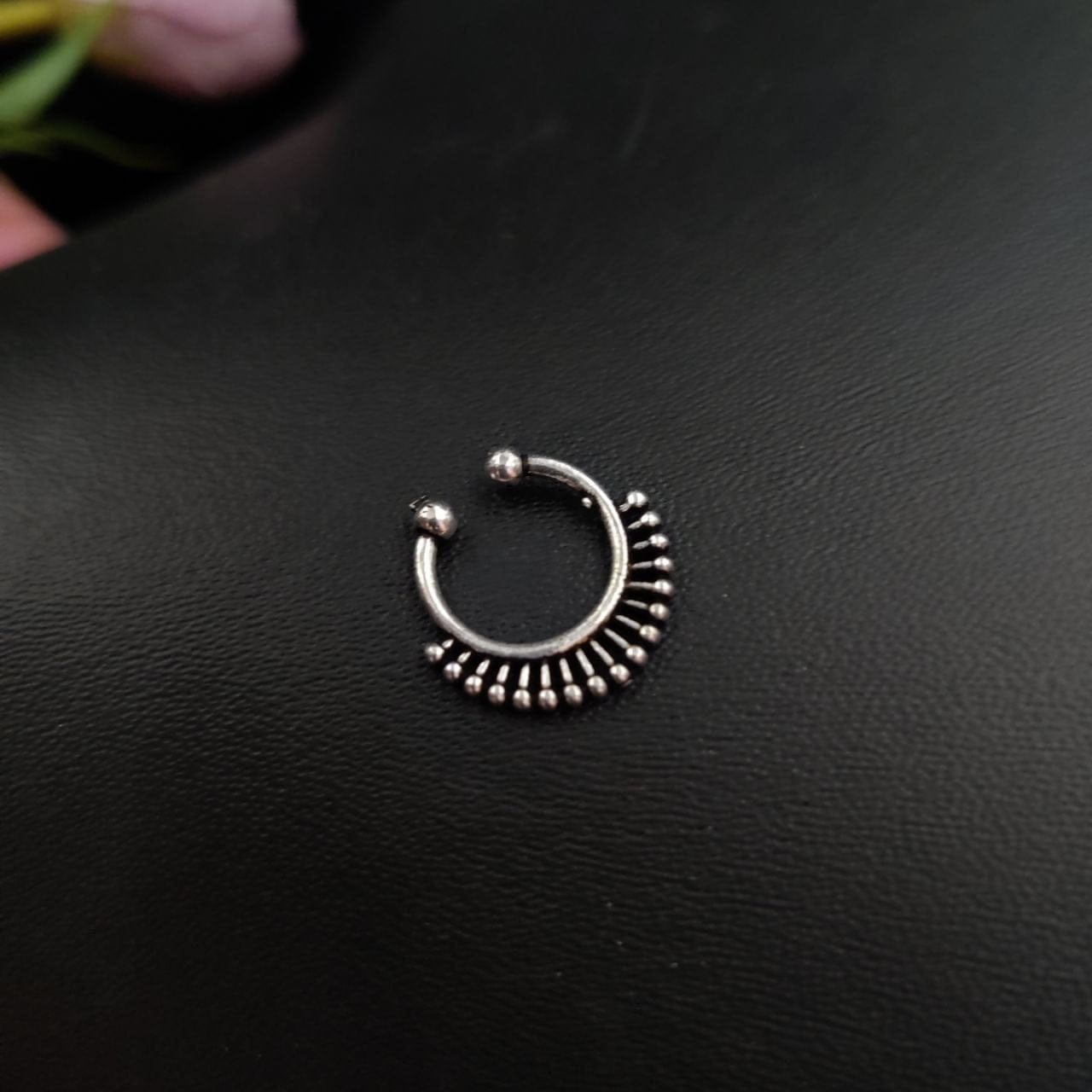 The oxidized finish, a hallmark of these nose rings, adds depth and character to the design. Through a meticulous process, the metal undergoes oxidation, resulting in a rich patina that enhances its visual appeal. This antiqued finish not only adds a touch of vintage charm but also lends a sense of authenticity to the piece, making it a coveted addition to any jewelry collection.