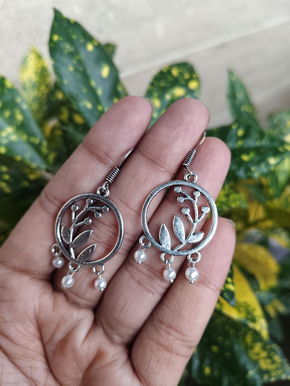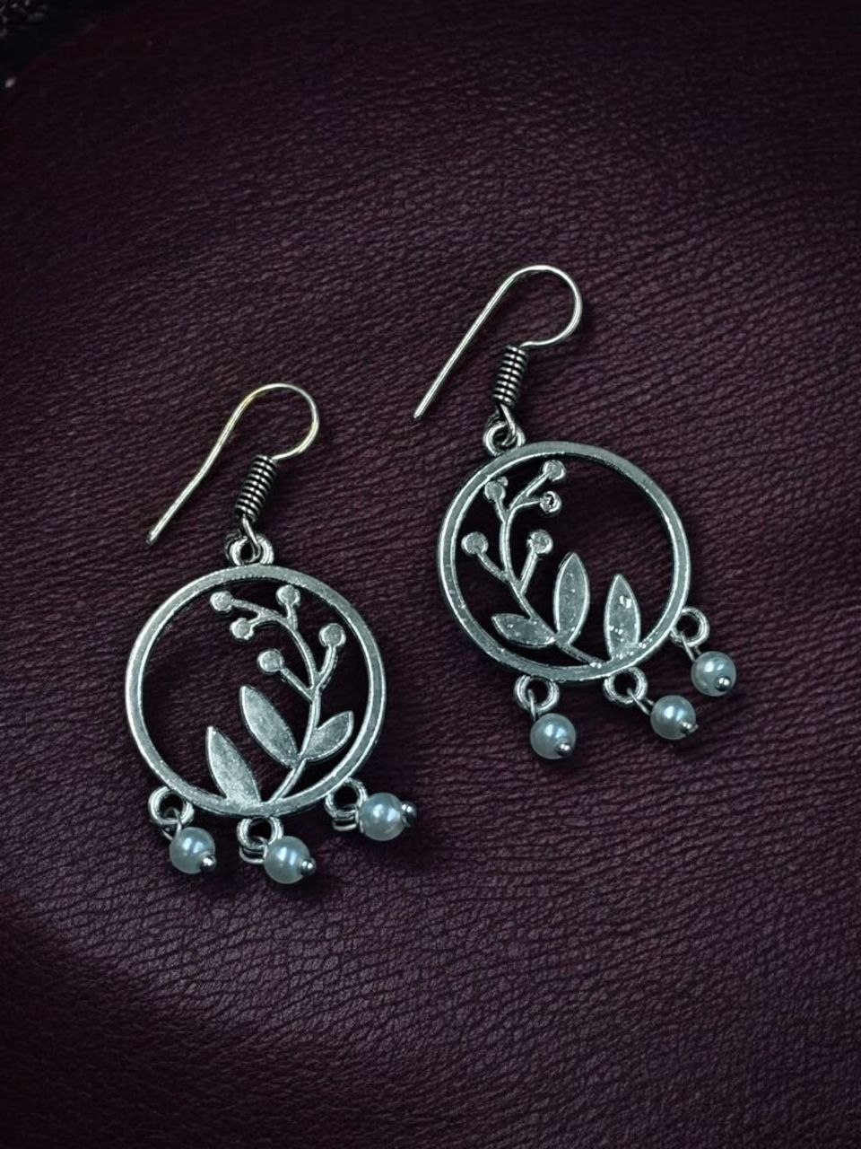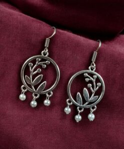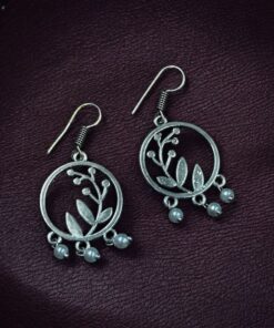 The earrings feature a beautiful combination of leaf and circle motifs, symbolizing harmony and natural beauty. The oxidized finish gives them a timeless antique appeal, making them versatile enough to pair with both ethnic and western outfits. Designed with precision, the hook dangler style ensures easy wear and a comfortable fit throughout the day.