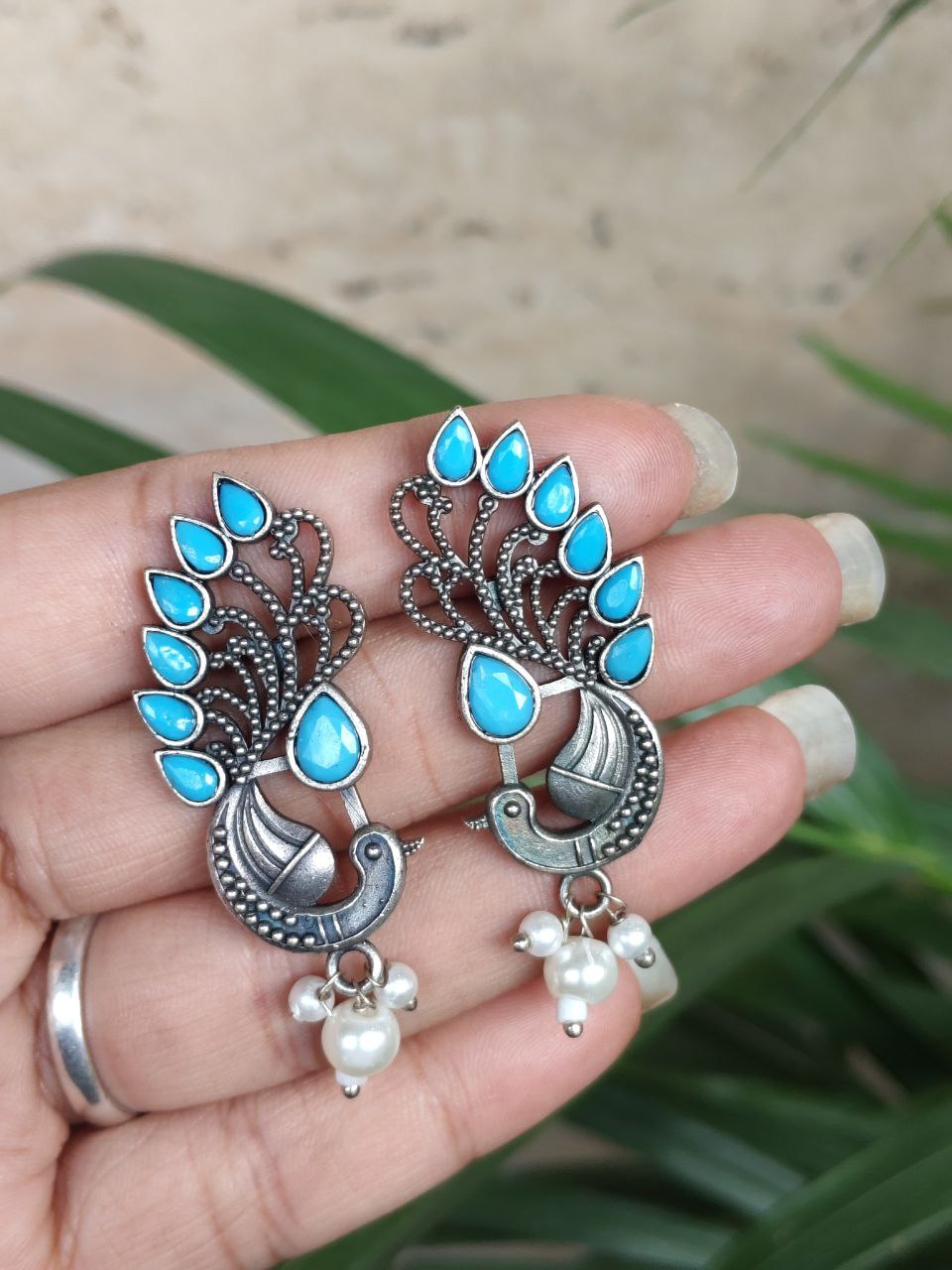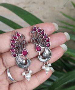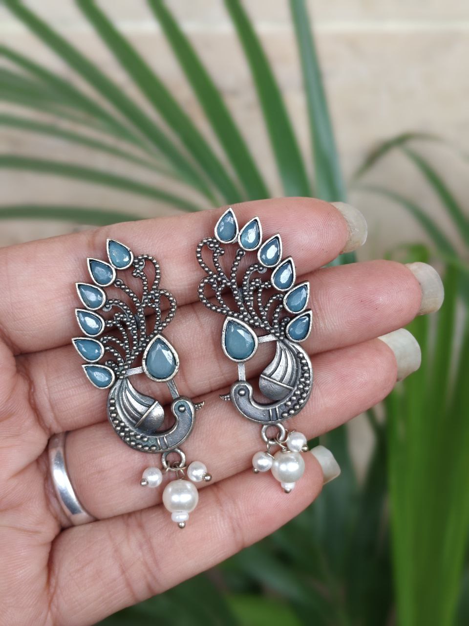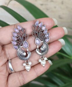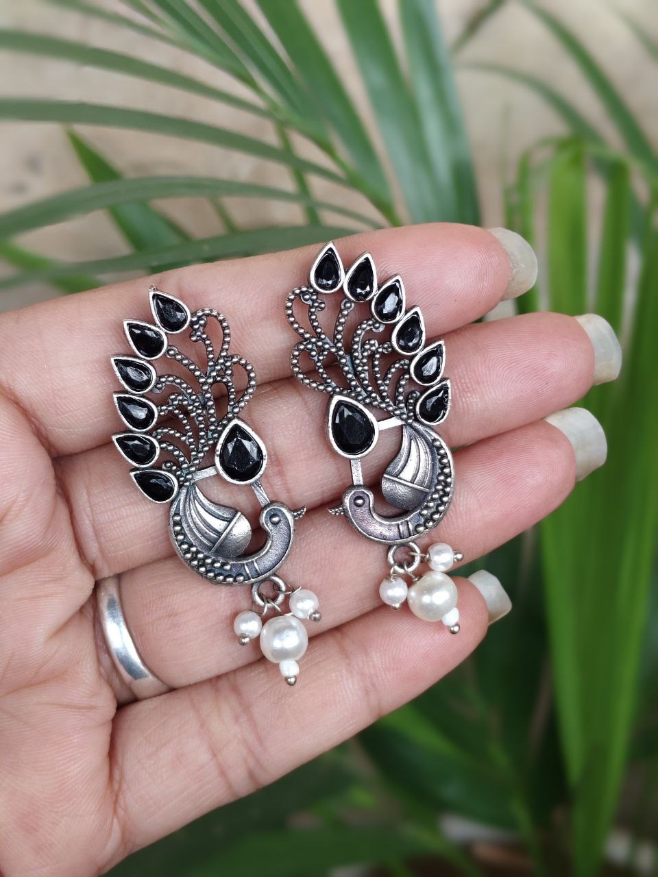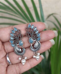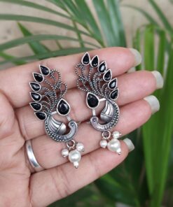 The Oxidized Peacock Earring is a timeless piece of jewelry that beautifully blends traditional artistry with modern elegance. Inspired by the graceful peacock motif, these earrings are crafted to enhance your ethnic and contemporary outfits effortlessly. The oxidized finish gives a vintage appeal, making it a must-have accessory for women who love classic yet trendy jewelry designs.