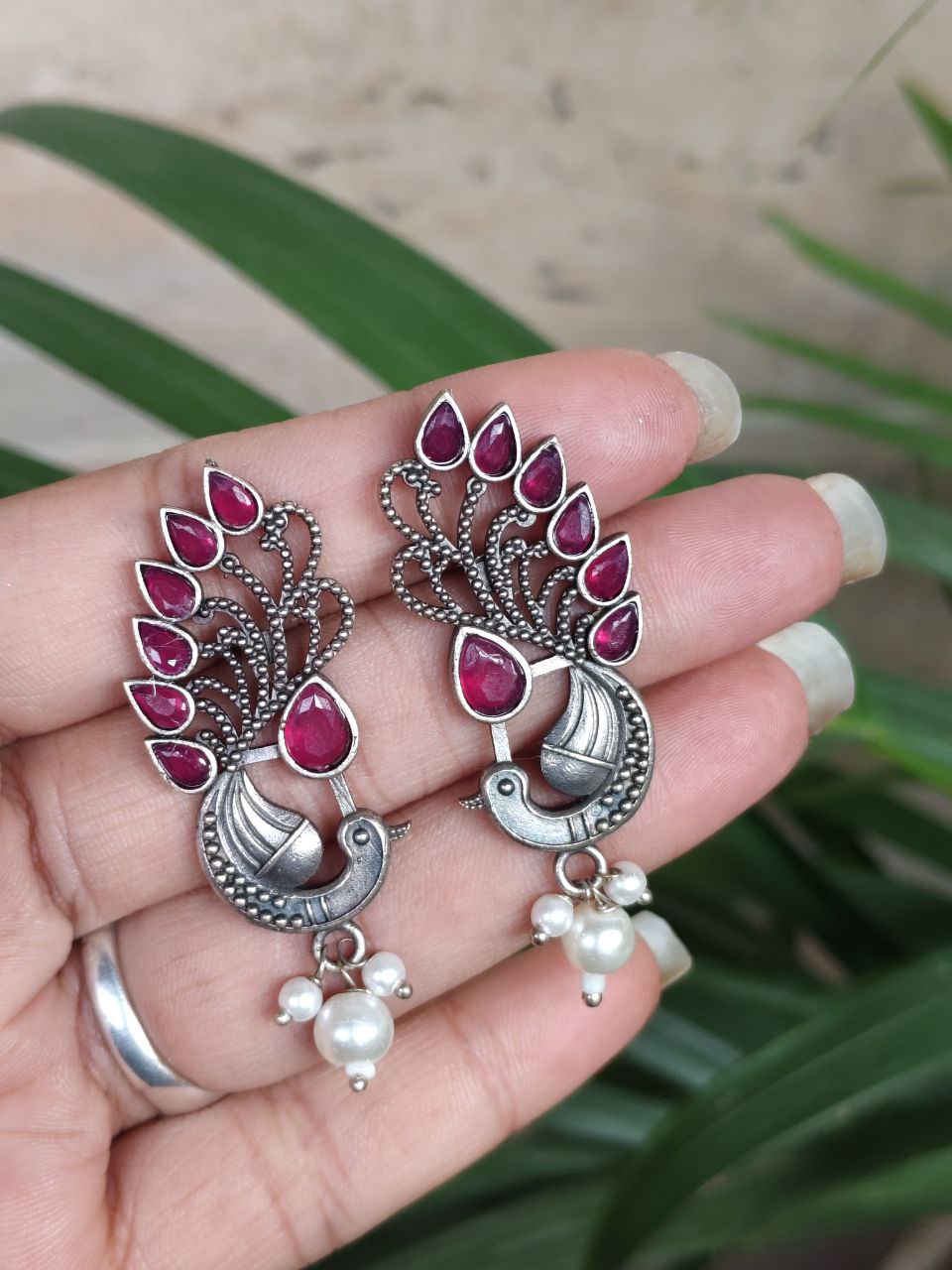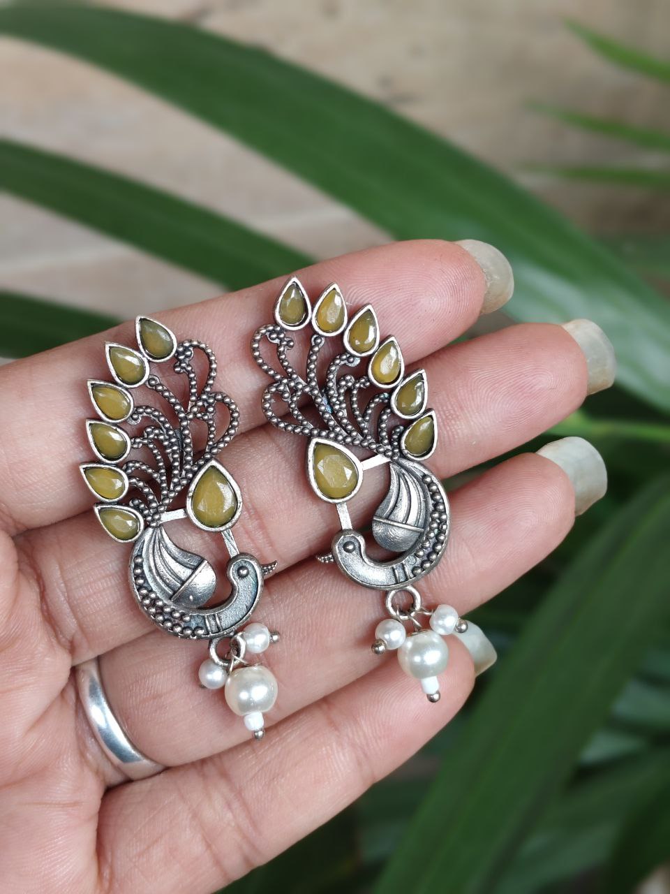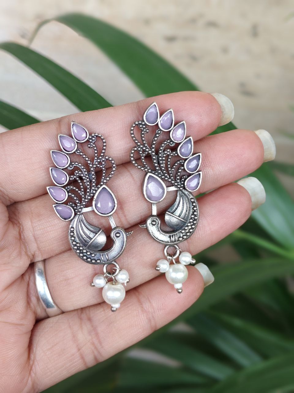 The Oxidized Peacock Earring is a timeless piece of jewelry that beautifully blends traditional artistry with modern elegance. Inspired by the graceful peacock motif, these earrings are crafted to enhance your ethnic and contemporary outfits effortlessly. The oxidized finish gives a vintage appeal, making it a must-have accessory for women who love classic yet trendy jewelry designs.