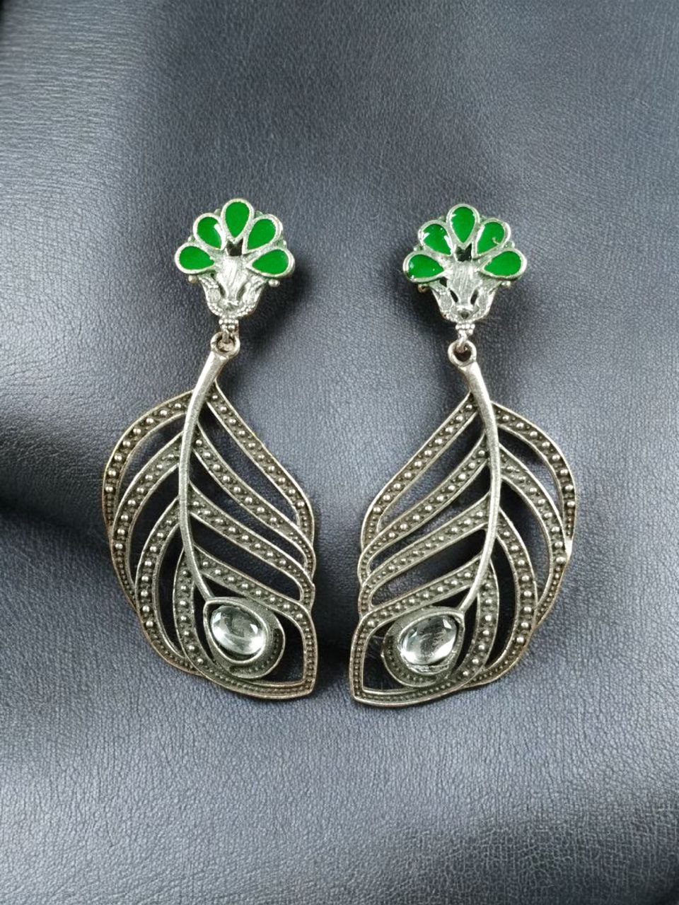 Crafted using premium-quality metal alloy, these Peacock Feather Earrings ensure durability and long-lasting shine. The oxidized polish ensures they remain timeless and easy to match with outfits of any season or occasion. They pair beautifully with kurtis, sarees, gowns, casual fusion wear, or even western dresses for a bold chic statement.